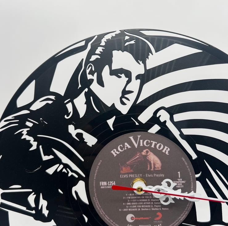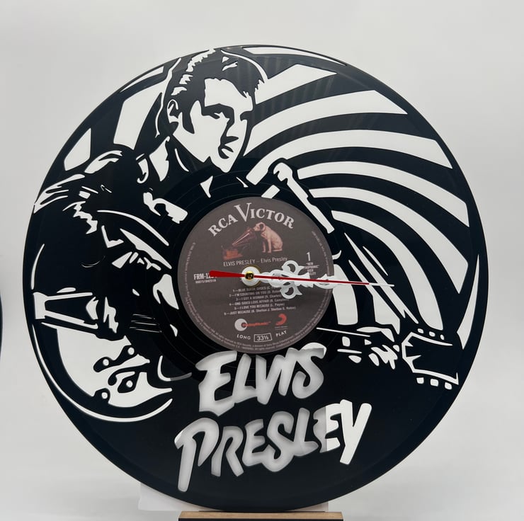 Elvis Presley–inspired laser-cut vinyl LP clock — a timeless tribute that fuses music history with functional design. Crafted from a classic record-style form, this clock features precision laser-cut detailing that captures the spirit and legacy of the King of Rock 'n' Roll.