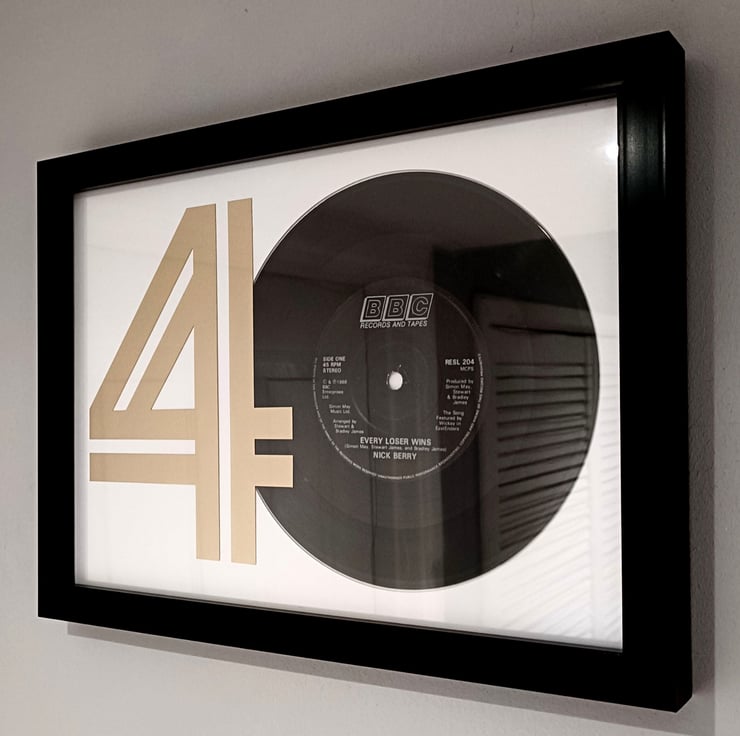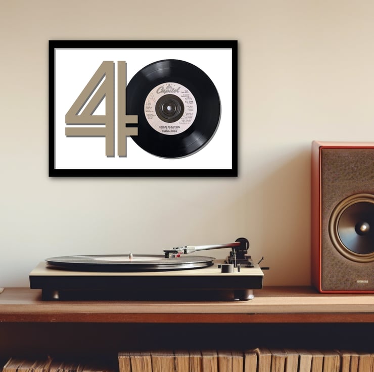 Each display features the original 7" vinyl of that chart topping track, paired with a vinyl cut number "4" that is placed in front of the vinyl record, completing the number "40" to create a striking milestone design.