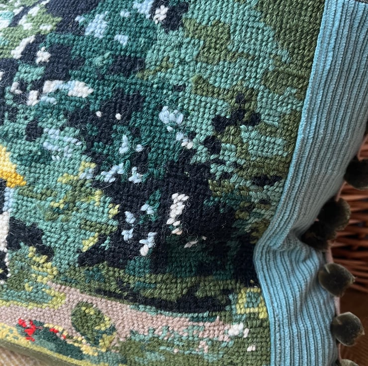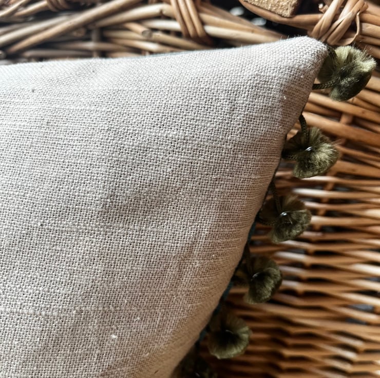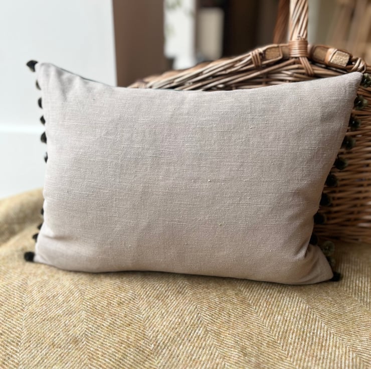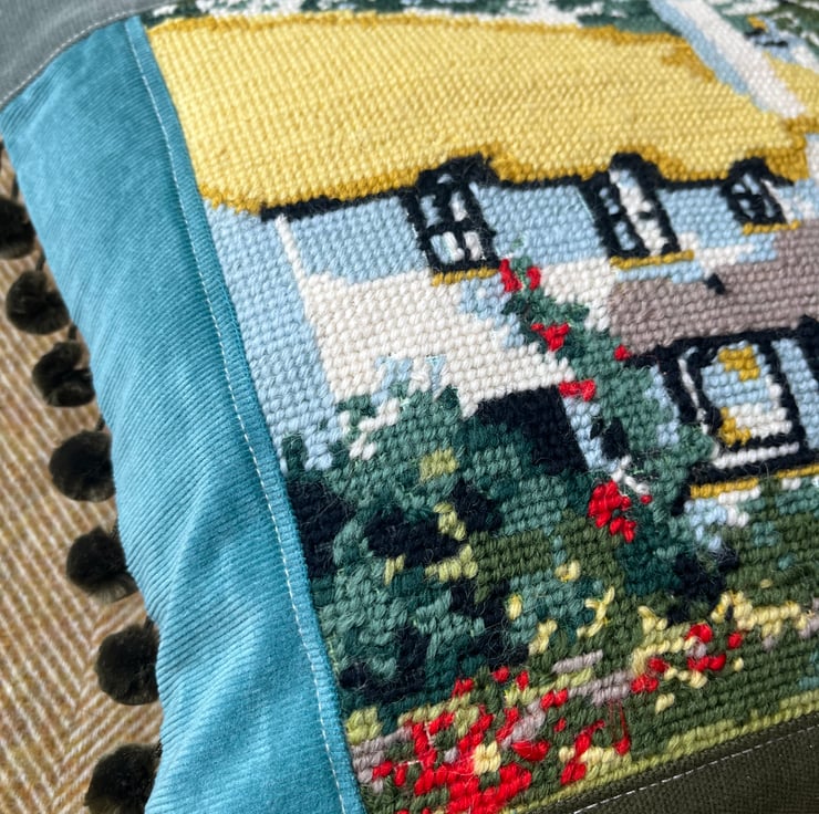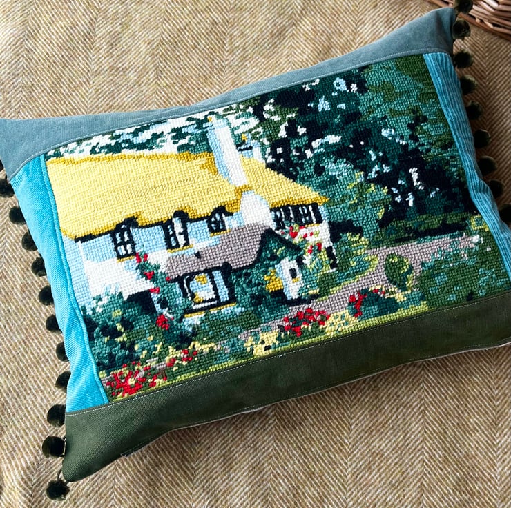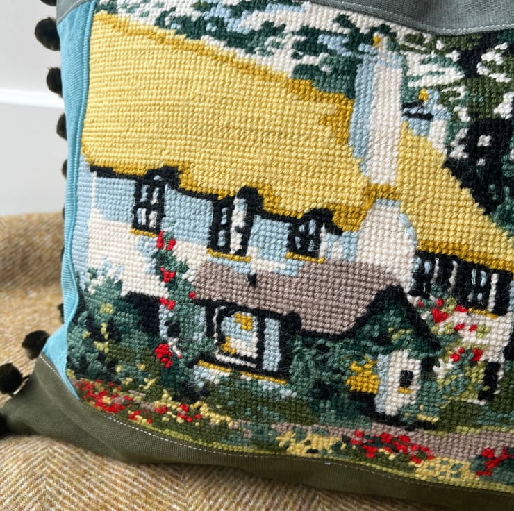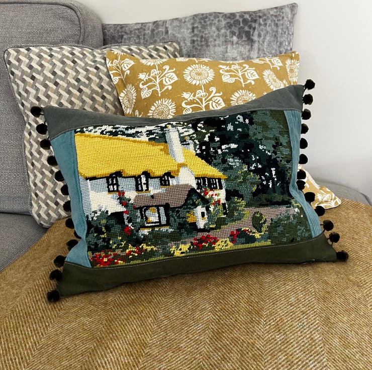 Beautiful one of a kind cushion cover with a pretty panel of vintage tapestry featuring a thatched country cottage. I've added green fabrics from sample swatches, including corduroy and needlecord, around the tapestry and the back is beige linen. The ends are trimmed with velvety olive coloured pompoms.