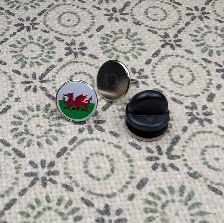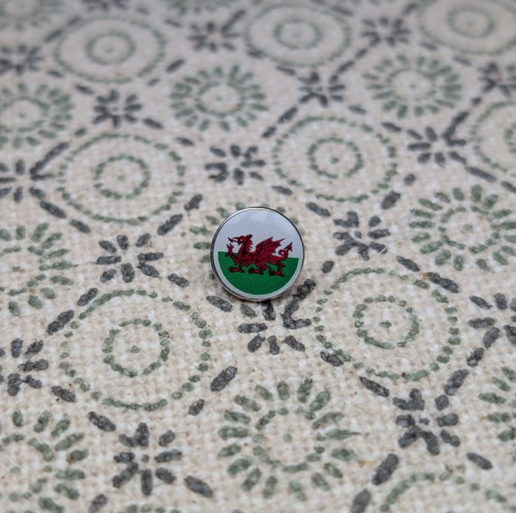 Wales Flag Pin Badge – small 10mm resin-coated pin featuring the iconic red dragon on a green and white background. Glossy, durable finish with vibrant colours. Ideal for jackets, hats, bags or lanyards. A subtle way to show Welsh pride or a perfect souvenir gift.