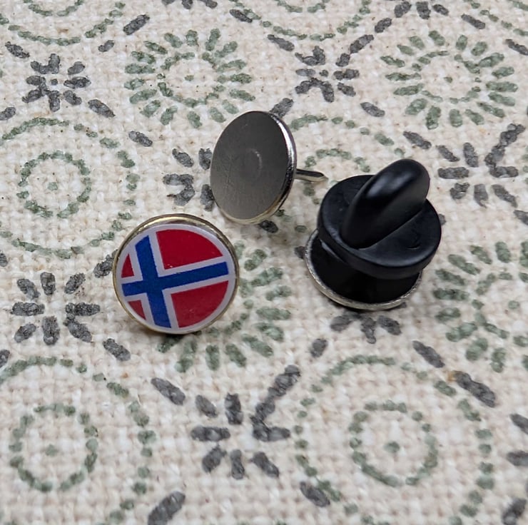 Show your Norwegian pride with this compact red, white, and blue Nordic cross pin. Each badge is handmade and sealed under a glossy resin dome for a vibrant, durable finish.