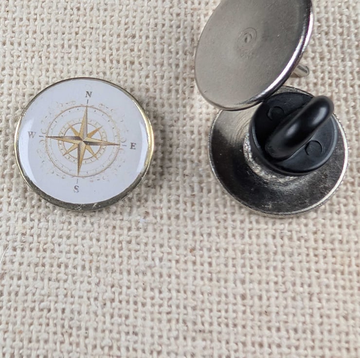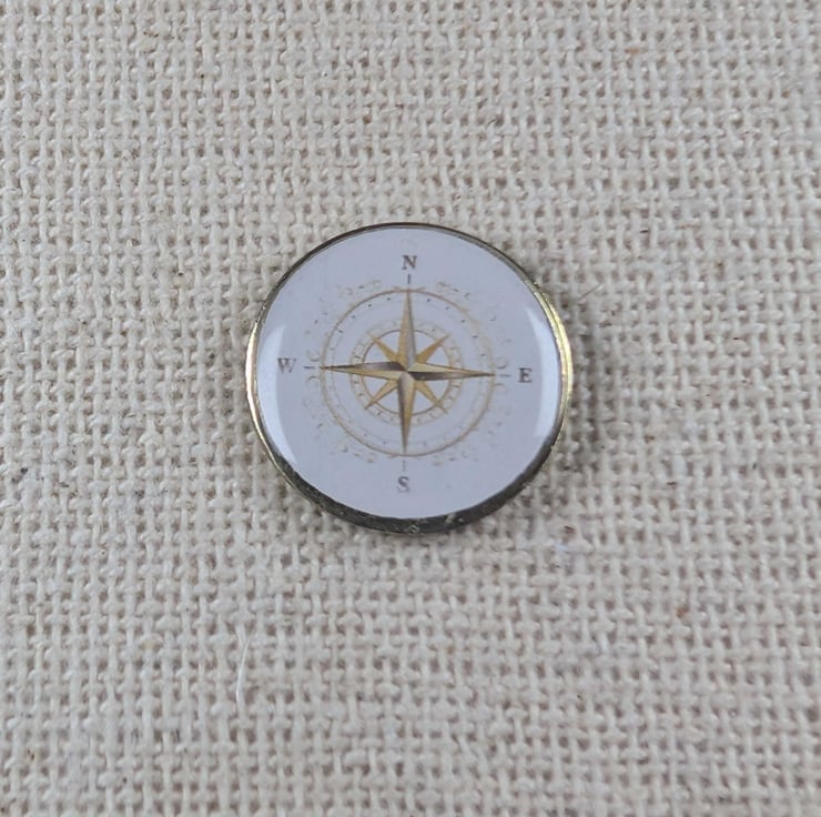 Gold Coloured Compass Pin - Travel Themed Badge - Large Resin Topped Pin Badge