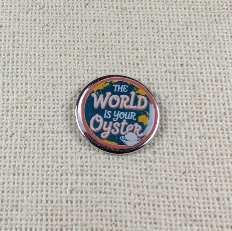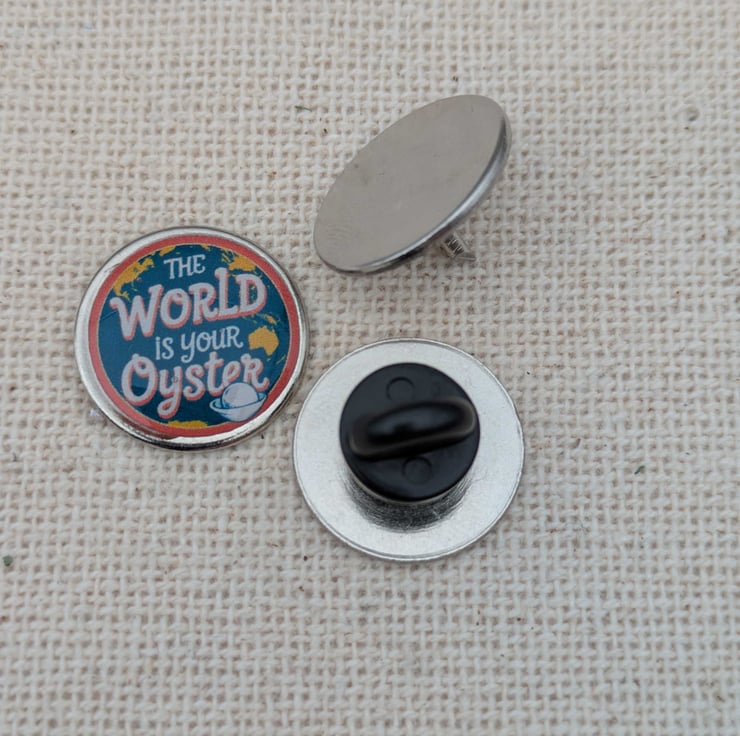 Celebrate your love of travel with our vibrant “The World is Your Oyster” badge. This durable 18mm pin features a glossy, resin-topped finish and a bold, travel-inspired design that captures the thrill of exploring new places. Lightweight yet eye-catching, it’s perfect for adding a touch of wanderlust to jackets, backpacks, hats, or even corkboards.