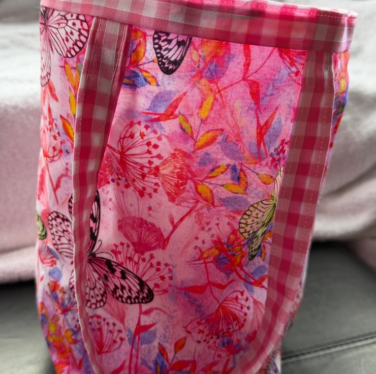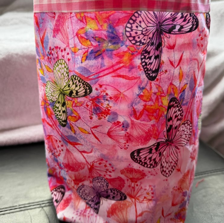 Hand made car bin/tidy/storage, pretty and useful, with a handle long enough to go over the headrest this bag is made from beautiful cotton with colourful butterflies and a red and white checked lining.