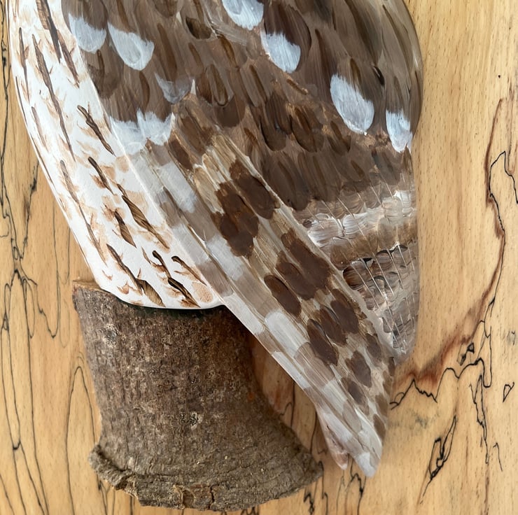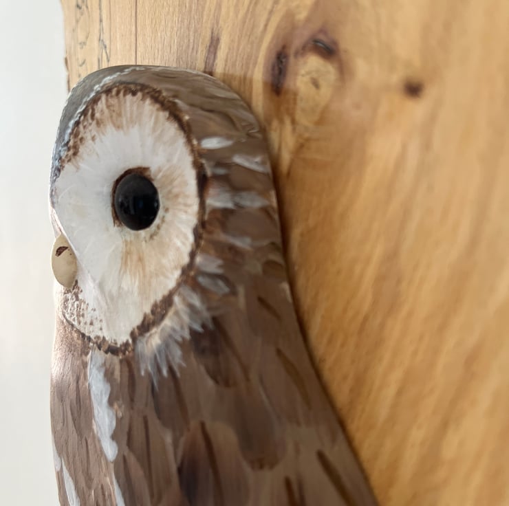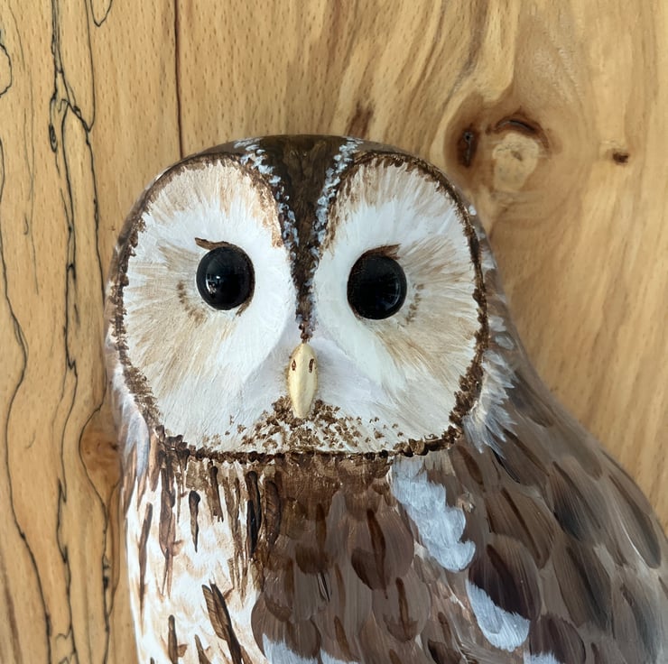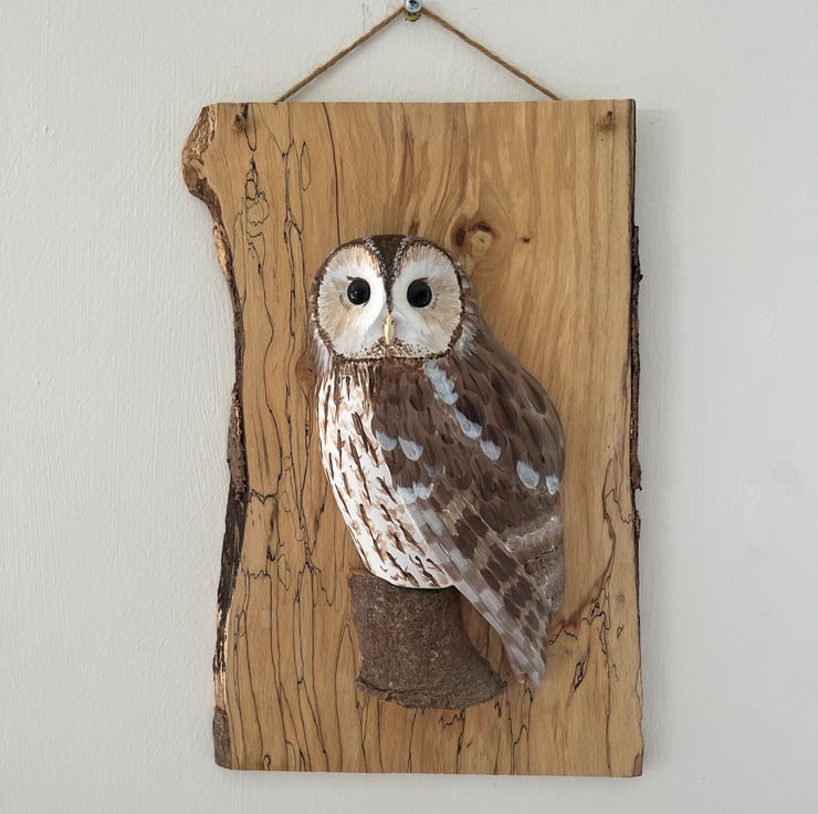 This hand carved tawny owl sitting on a tree stump is mounted on a spalted beech panel. It has glass eyes and has been painted with artists acrylics and finished with wax to give a soft shine. The panel is 31cm x 20cm and is hung on a piece of twine.