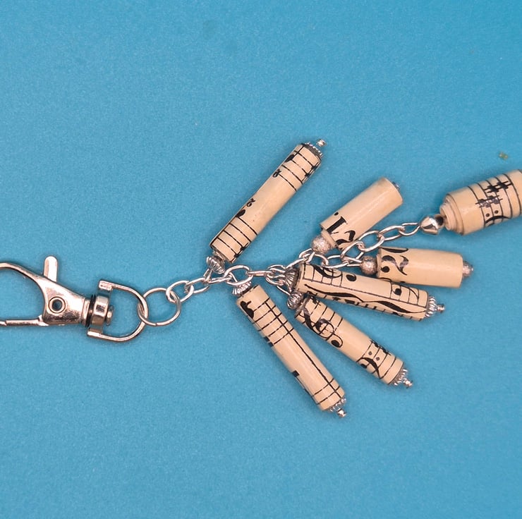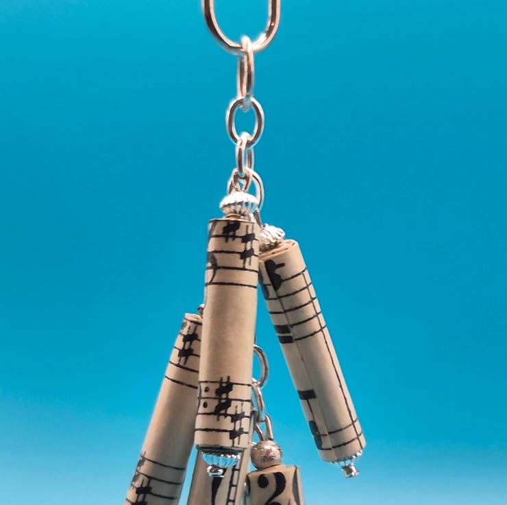 I recycled an old piano exercises book called Czerny and hand rolled it into beads of differing sizes. The beads were then dangled from a key ring clasp to make a pretty accessory which could be used as a keyring or a handbag charm.