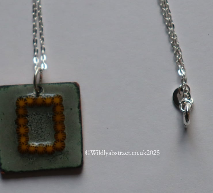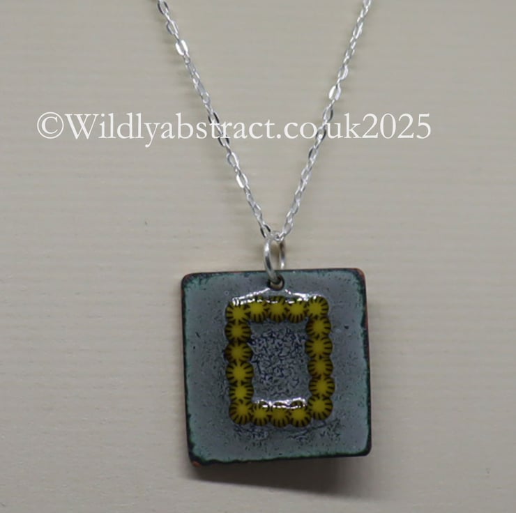 This unique pendant was hand-crafted using traditional kiln-fired enamel techniques. It features; a square hand-pierced copper shape, grey vitreous enamel, opaque yellow checkered glass seed beads melted into the enamel. The pendant is counter-enamelled for a professional, wearable finish. It is suspended from a sterling silver chain and measures 2cms x 2cms with a total necklace length of 25cms. The pendant will be supplied in a gift box.