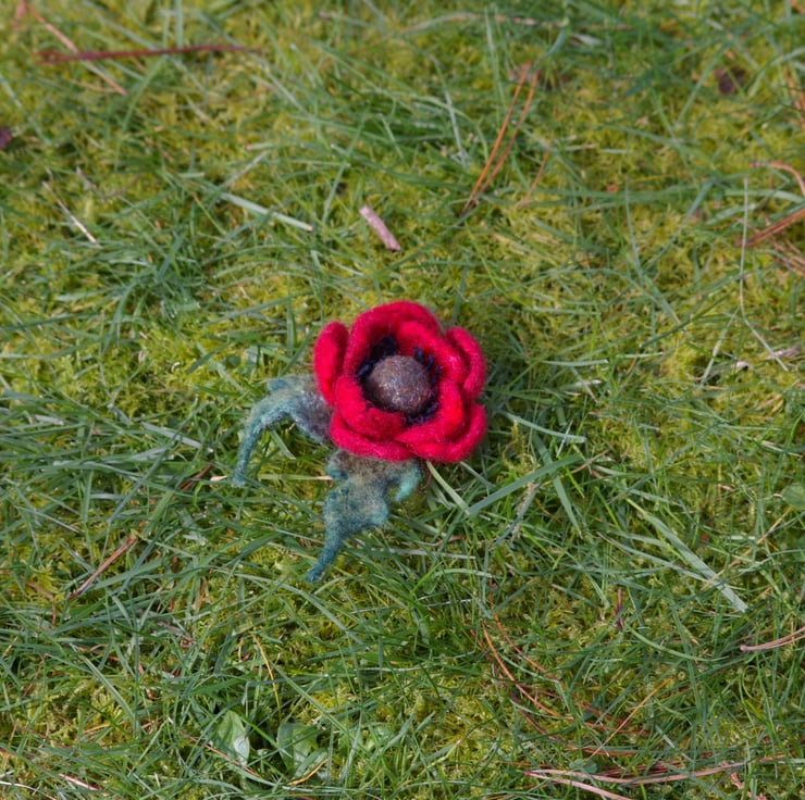 Handmade felted wool brooch inspired by a bright red poppy flower. Created using the traditional wet felting technique, it features soft, textured petals, a detailed center, and natural green leaves.