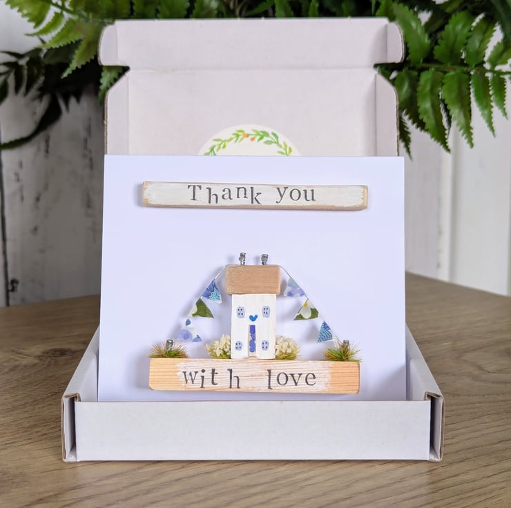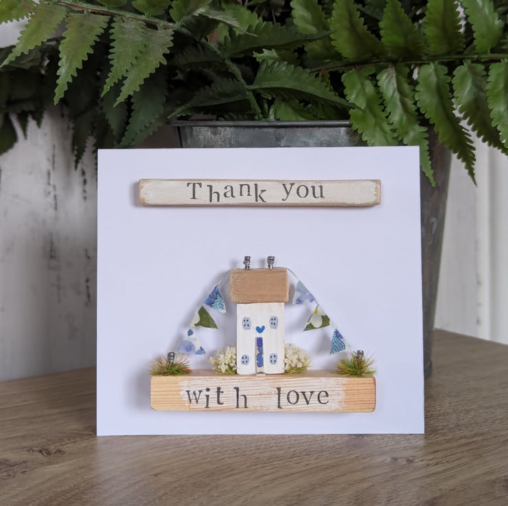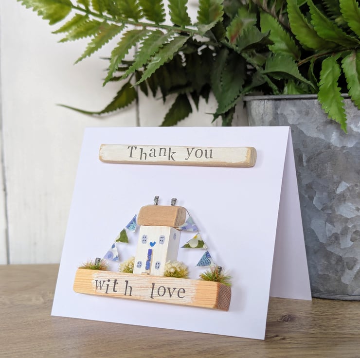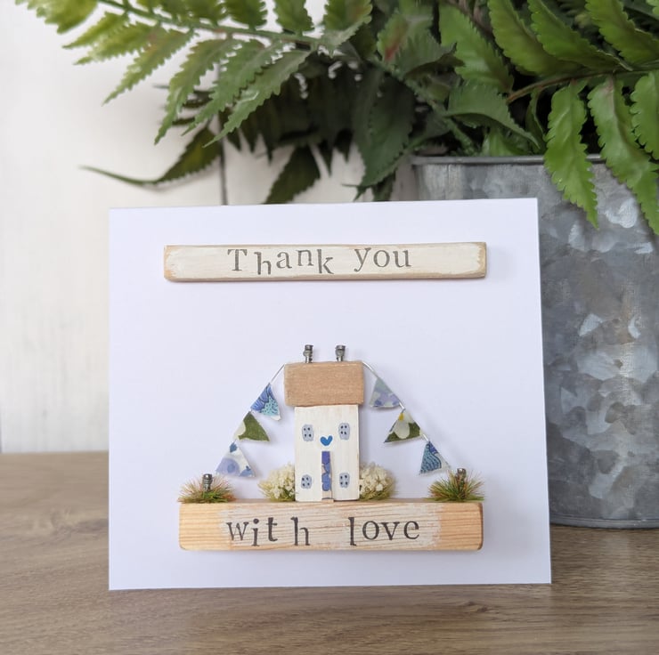 The card has a hand stamped 'Thank you' message on the front and 'With Love' on the base.