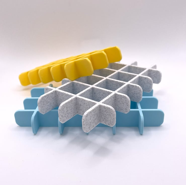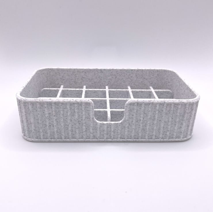 This entire item is 3D printed using PLA, which is a material derived from renewable, starch-based sources (like corn). It is designed to be tough enough for daily use near water. The cool baby blue and bright yellow combination adds a pop of modern colour to your space.