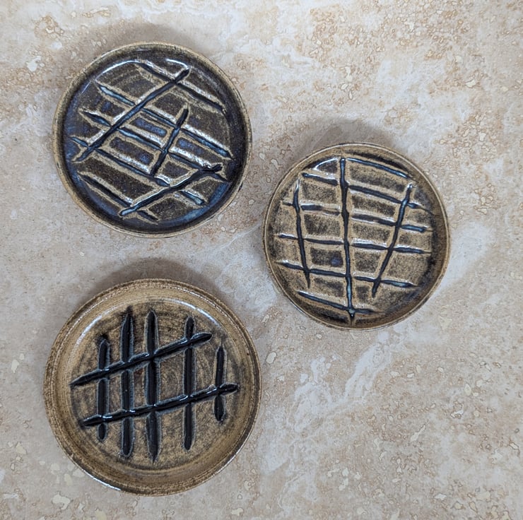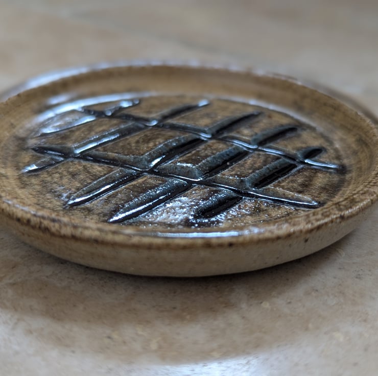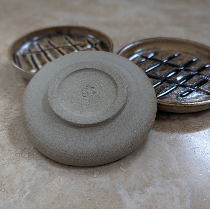 Rustic looking hand thrown stoneware soap dish. With hand carved hash design recesses to keep drips away from your chosen soap bar.