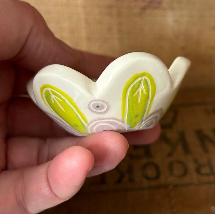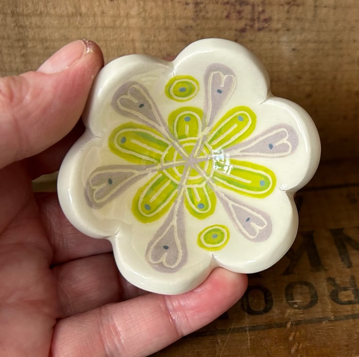 This little ceramic dish is made from white earthenware clay and hand decorated with my own flower design to both the inside and the outside. It has then been finished in a clear, glossy glaze. Perfect as a little trinket dish or just as a beautiful decorative item.