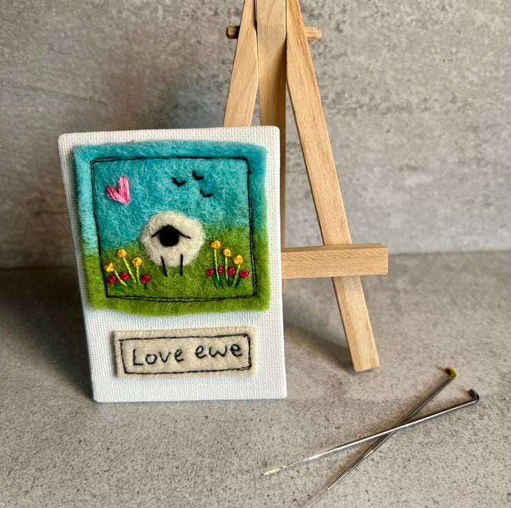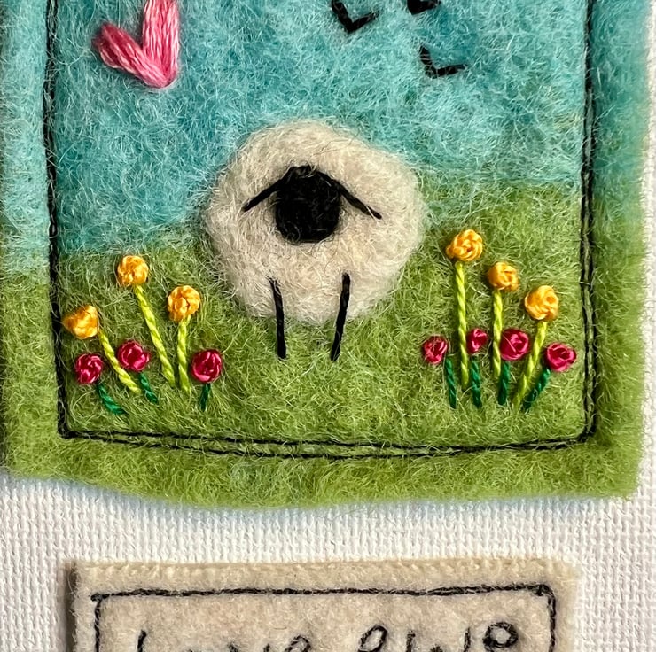 Cute mini canvas felting of sheep with flowers and love ewe wording