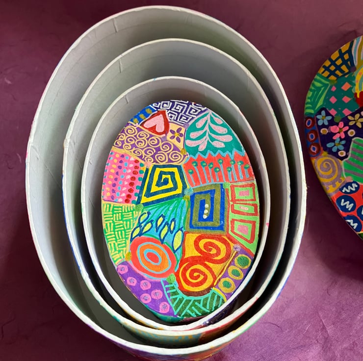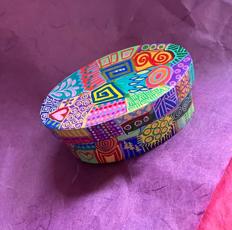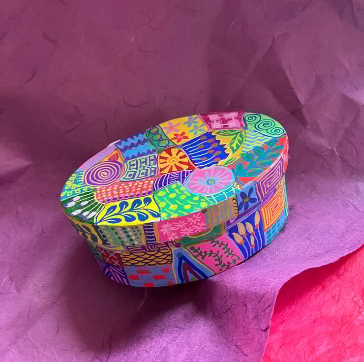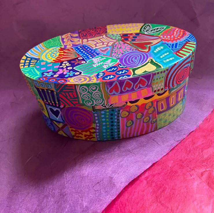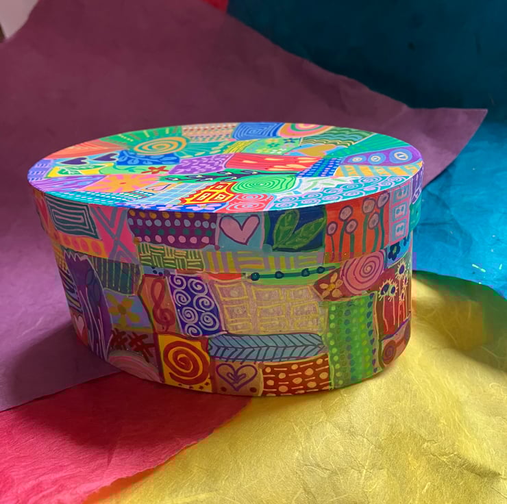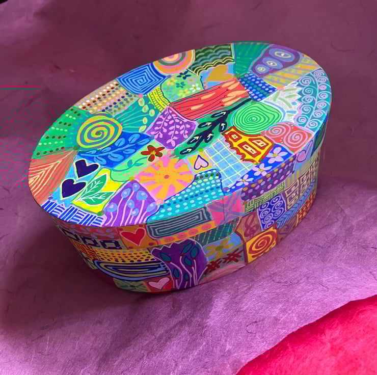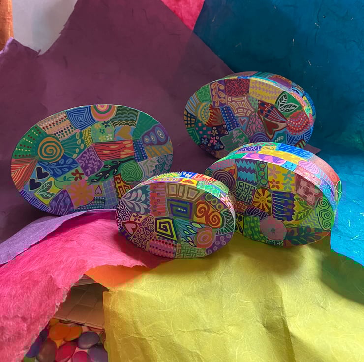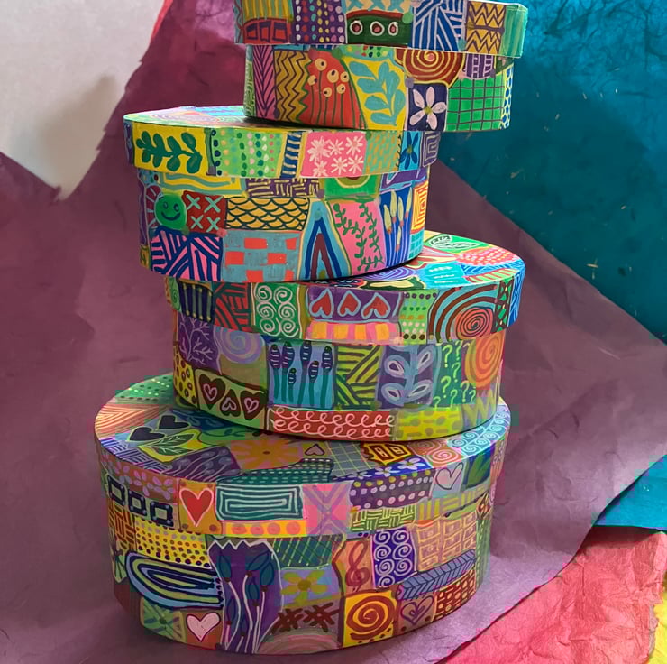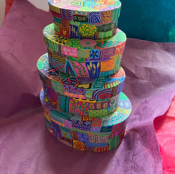 Here we have a set of 4 oval and strong cardboard gift boxes in 4 different sizes. They have been hand painted on the outside in a variety of glorious colours featuring Cats in the House doodles.