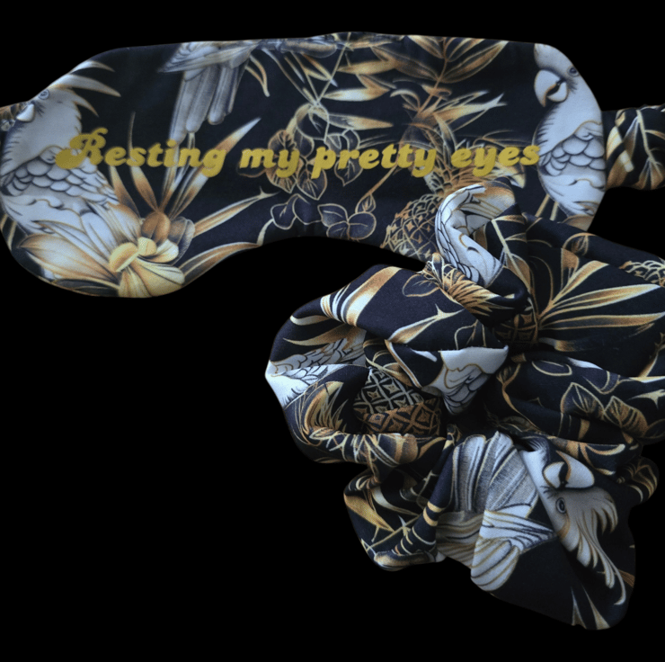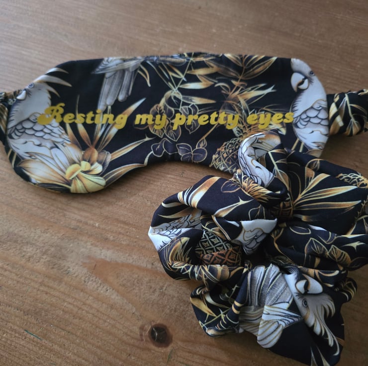Treat yourself to a lovely sleep eye mask with a matching scrunchie its designed for comfort with nice soft material great for travelling or if your just winding down mask size one size fits all as strecther elastic care instructions hand wash and air dry
