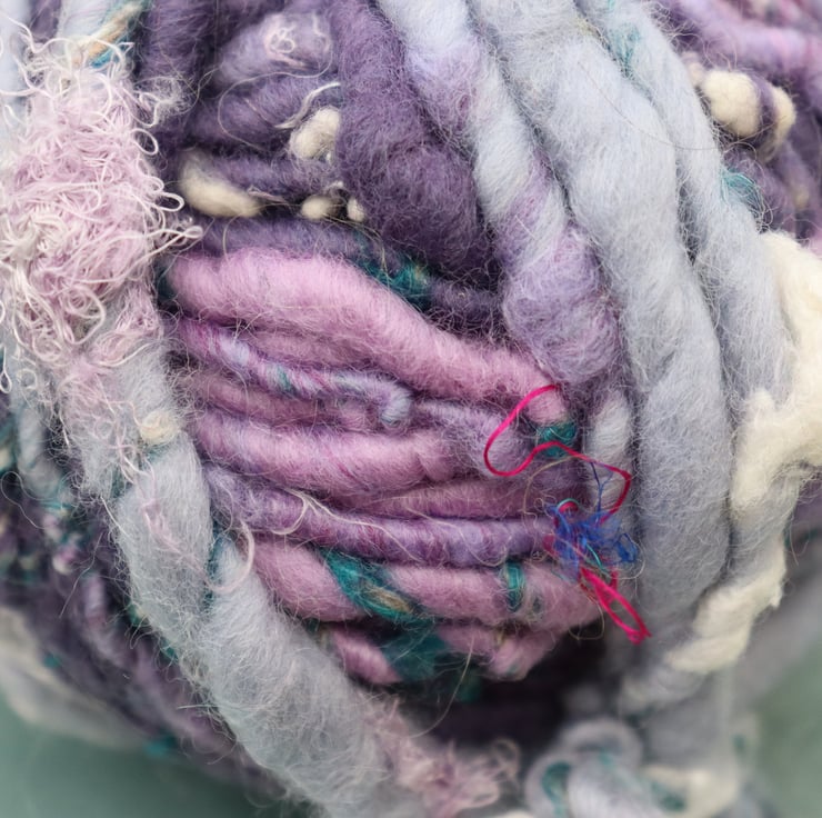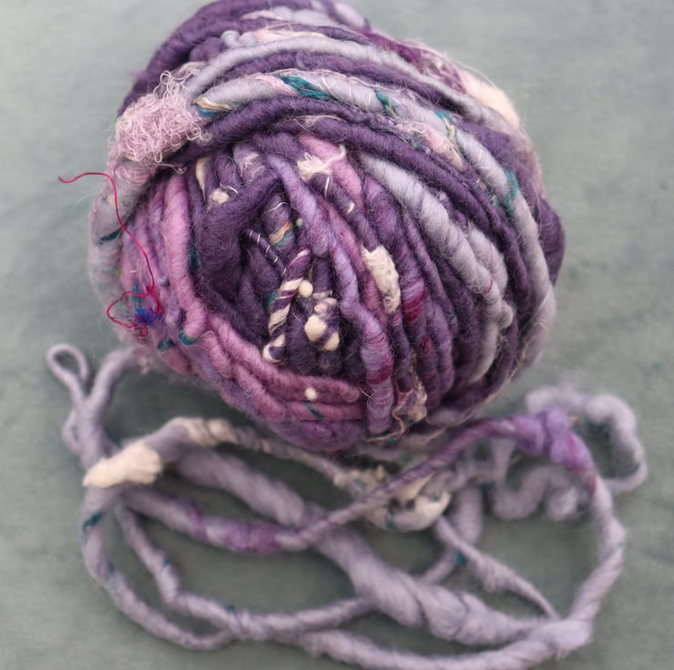 Core spun chunky art yarn spun created from wool with additions of cotton and highlights of silk.