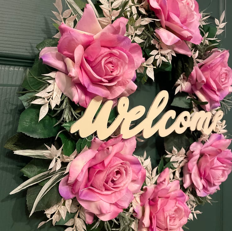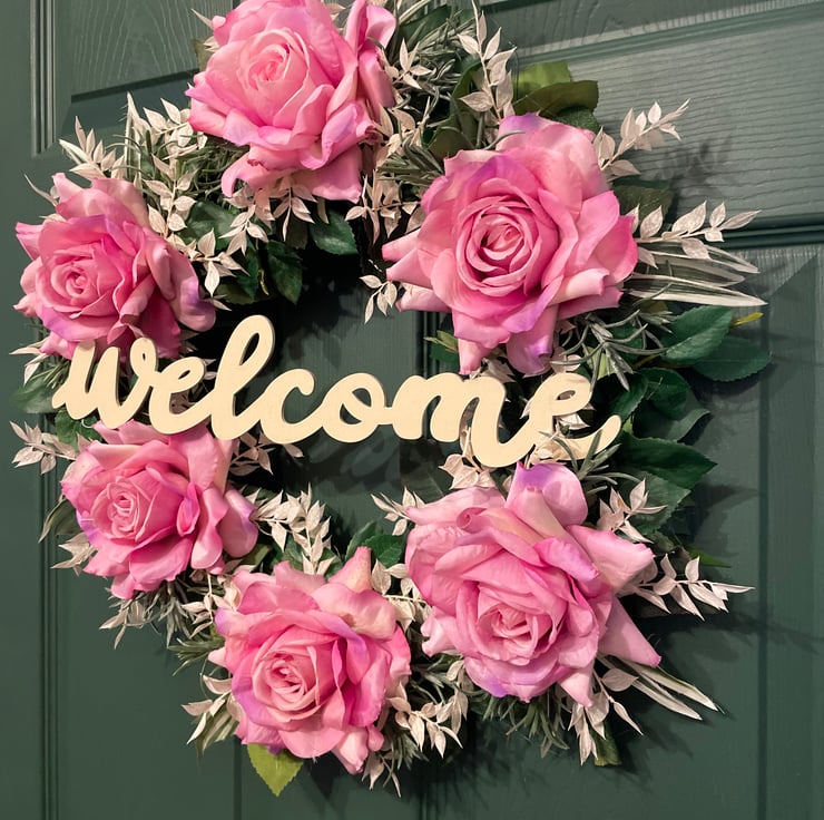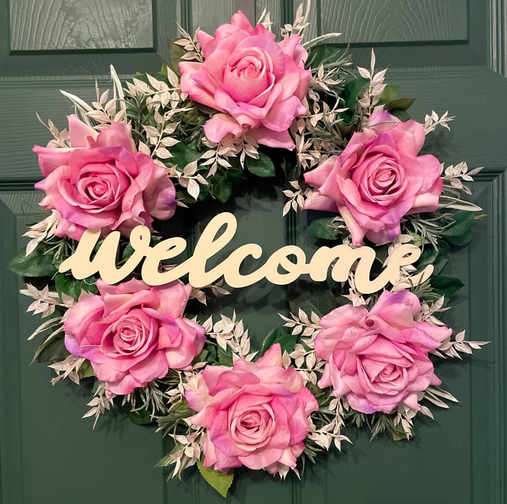 Brighten up your home with this stunning, handcrafted floral wreath. Measuring 47cm in diameter, this piece features lush, high-quality pink roses nestled among delicate silver-green foliage. In the centre, a charming wooden Welcome sign invites guests with warmth and style.