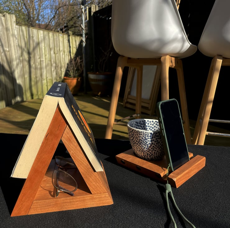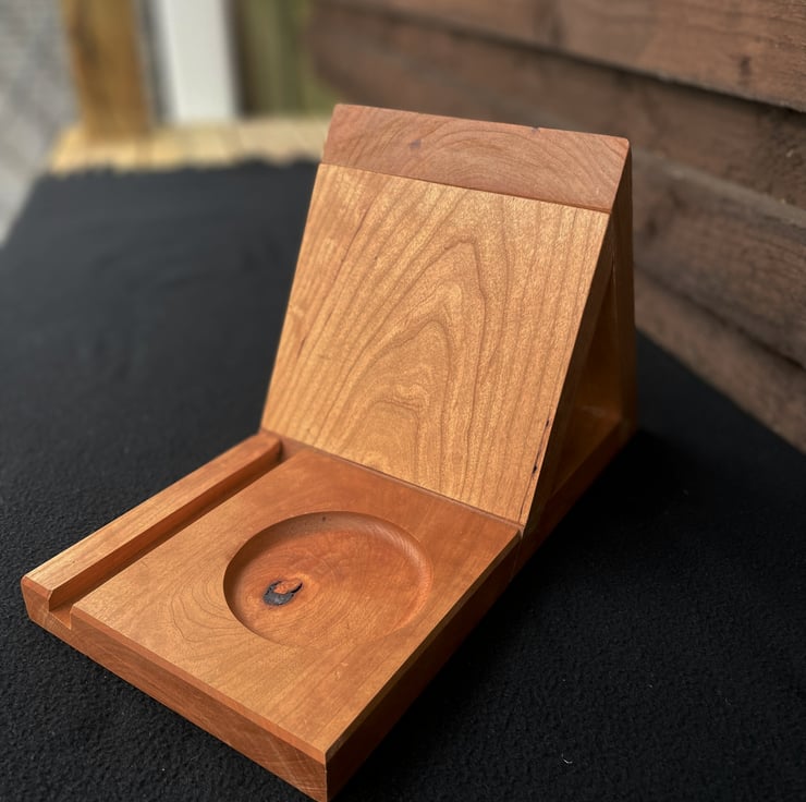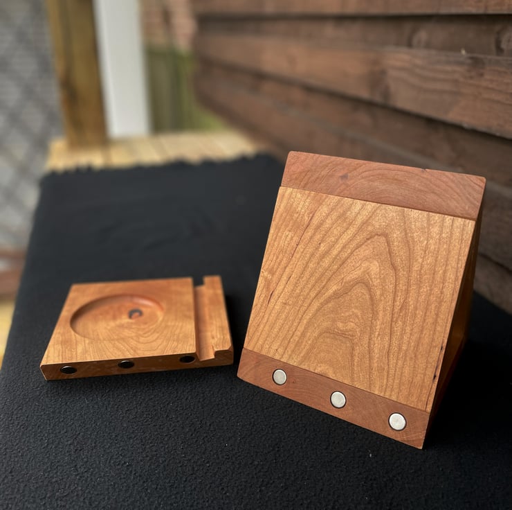 The angled triangular structure provides stable support while maintaining a clean and minimal form. A removable tray attaches using neodymium magnets, aligning naturally and settling into position with a subtle magnetic connection. The tray can also be used separately for a phone, cup or small everyday objects.