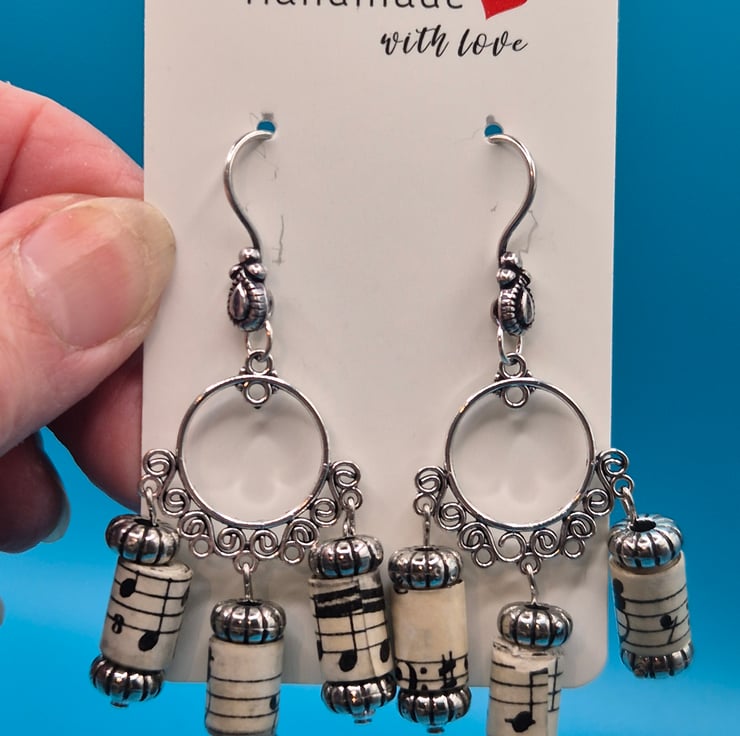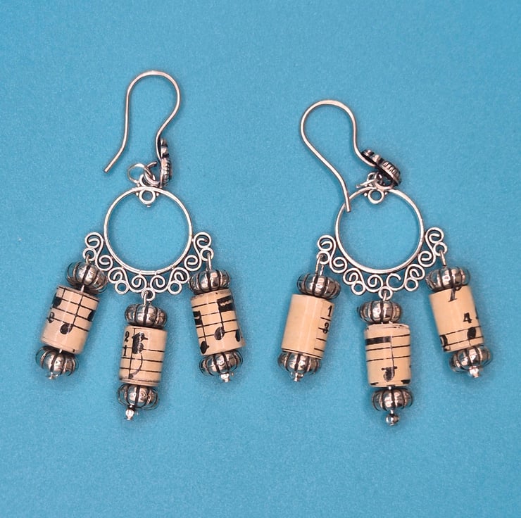 Ornate statement earrings made with vintage music sheets which were cut into strips, rolled into cylindrical beads which were then varnished. The ornate hoops and the recycled beads used to complement the paper beads contributed to giving an oriental style to the final design.