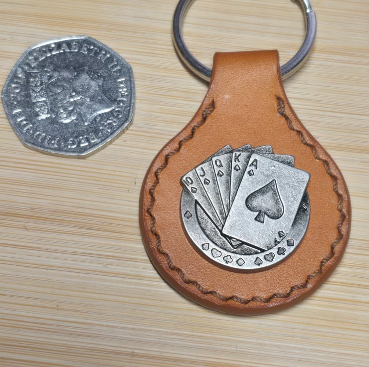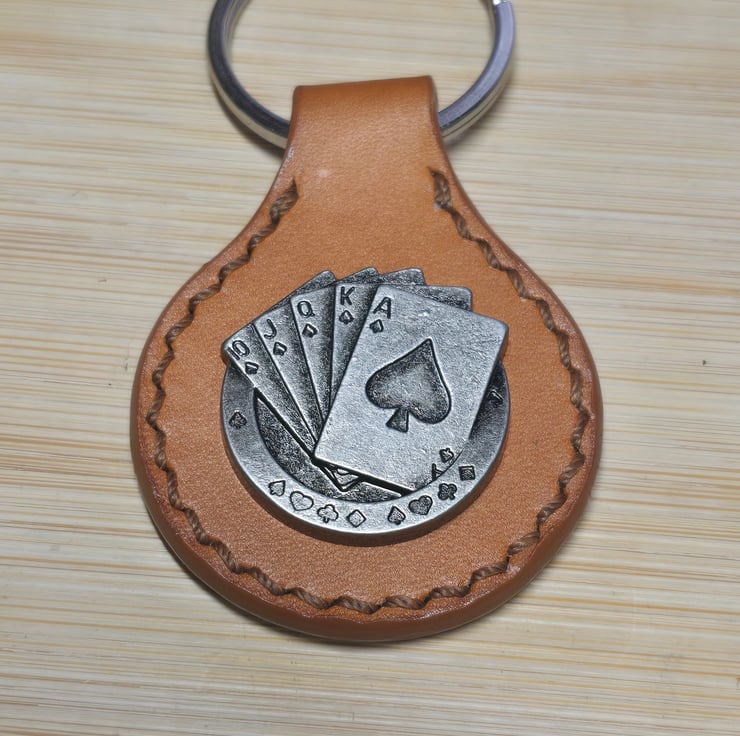 Handmade leather keyring featuring a playing card concho, crafted from Italian vegetable tanned leather, durable, practical and designed to develop a patina over time.
