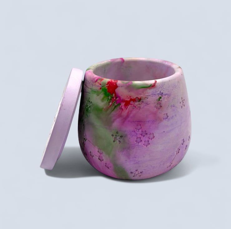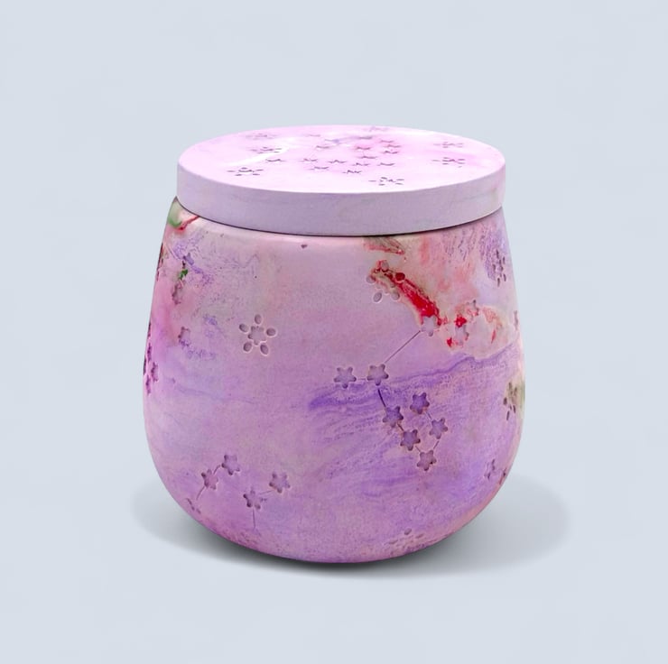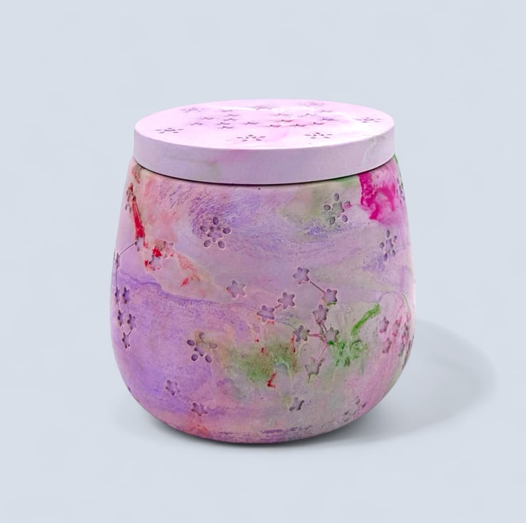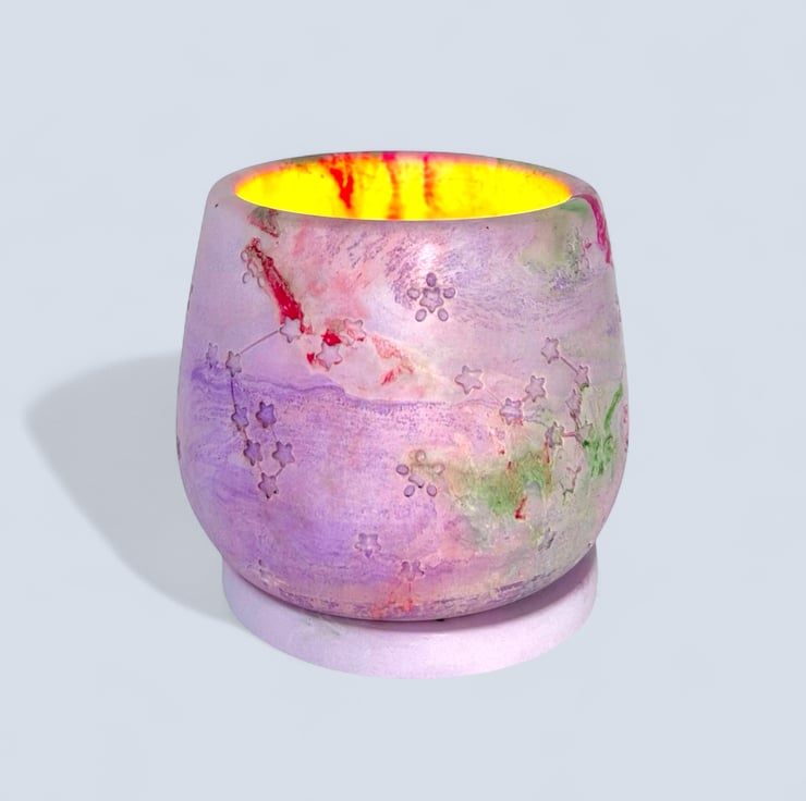 This piece was inspired by the shifting colours of the Northern Lights, where soft lilac and pink blend with green and touches of red across the night sky. The marbled finish reflects that natural movement, with each colour flowing into the next to create a calm, atmospheric feel.