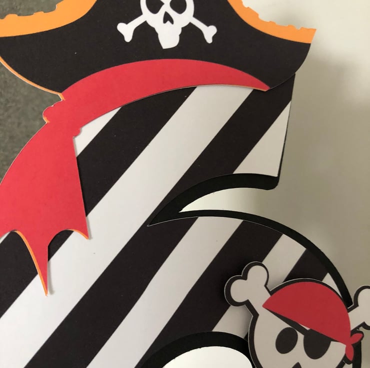 Made from layers of black & stripy card with a cut out pirate hat & skull & cross bones attached to the front. A layered scroll name banner with fancy lettering is attached to the bottom.