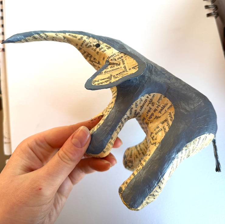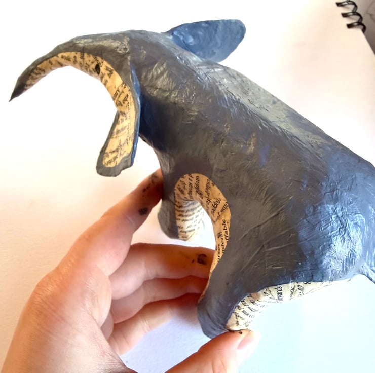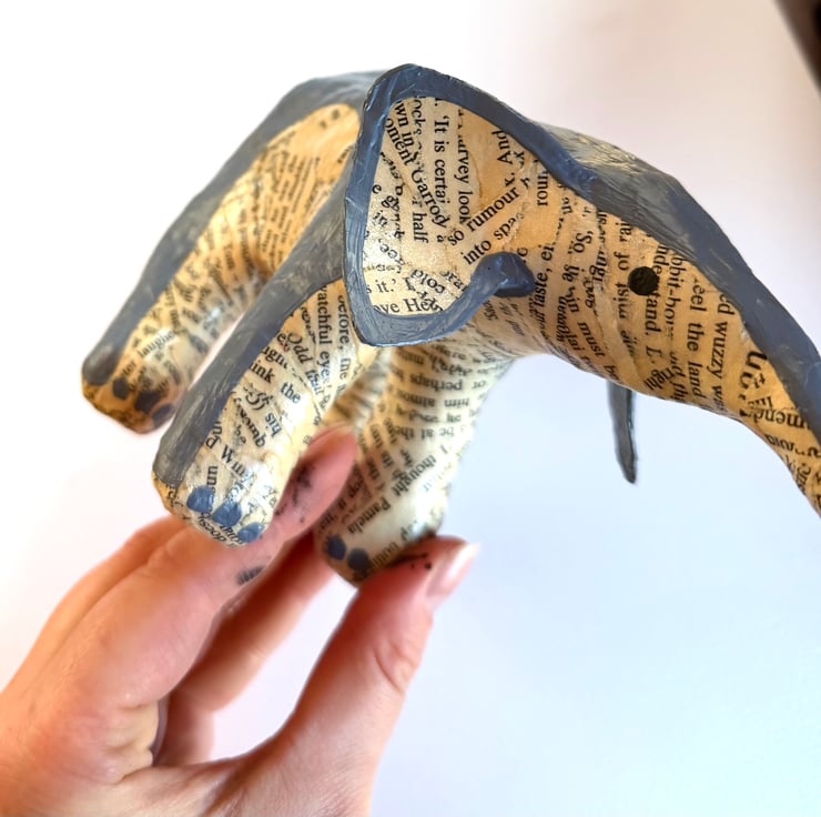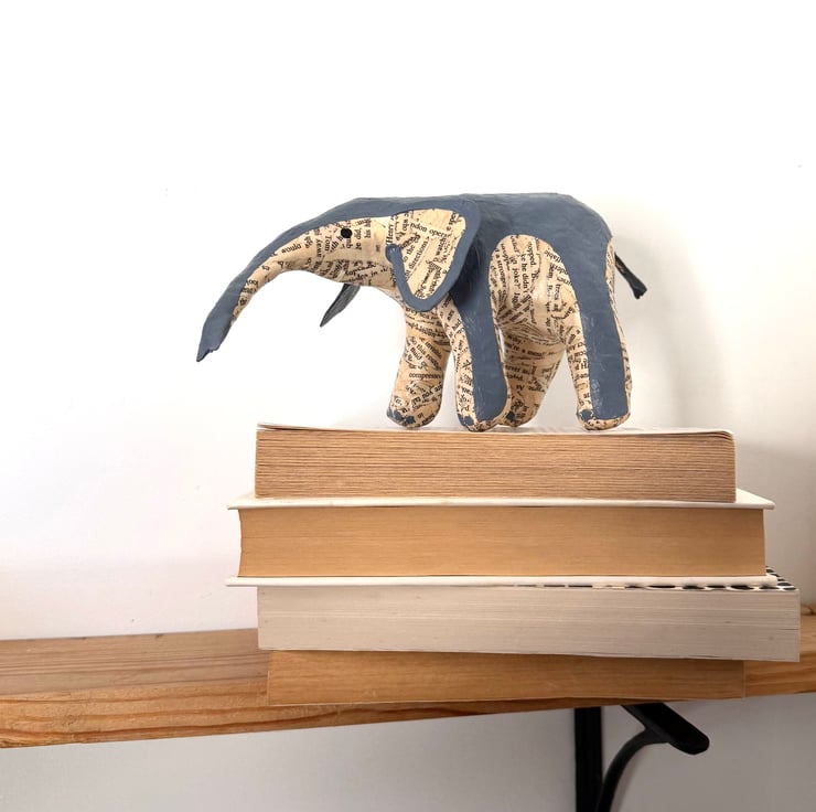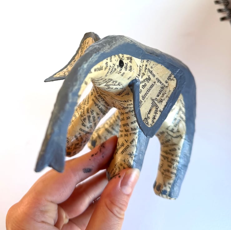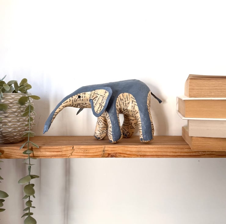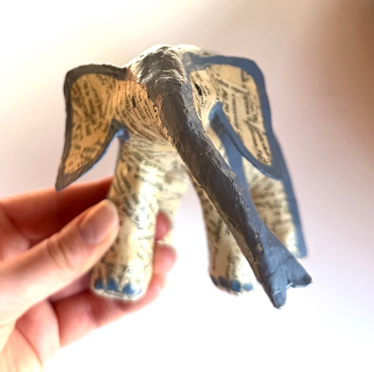 Paper elephant model hand made from papier-mache and acrylic paint. Coat colour made from recycled book pages.