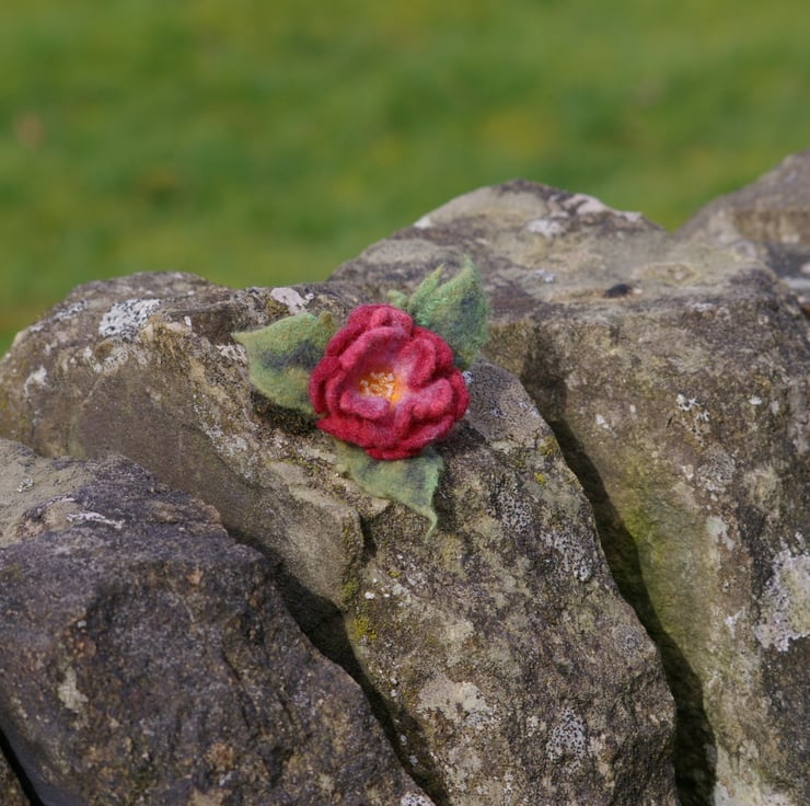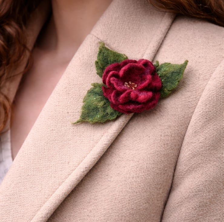 This charming brooch is handcrafted from natural wool using the wet felting technique. Designed in the shape of a delicate flower with soft green leaves, it features rich, deep red tones that add a warm and elegant touch.