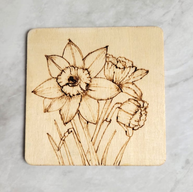 This square wooden coaster has had daffodils hand drawn and hand burned on to it using a pyrography pen. The coasteris then fully coated several times in a clear polyurethane varnish which provides a surface that can be cleaned with a damp cloth.