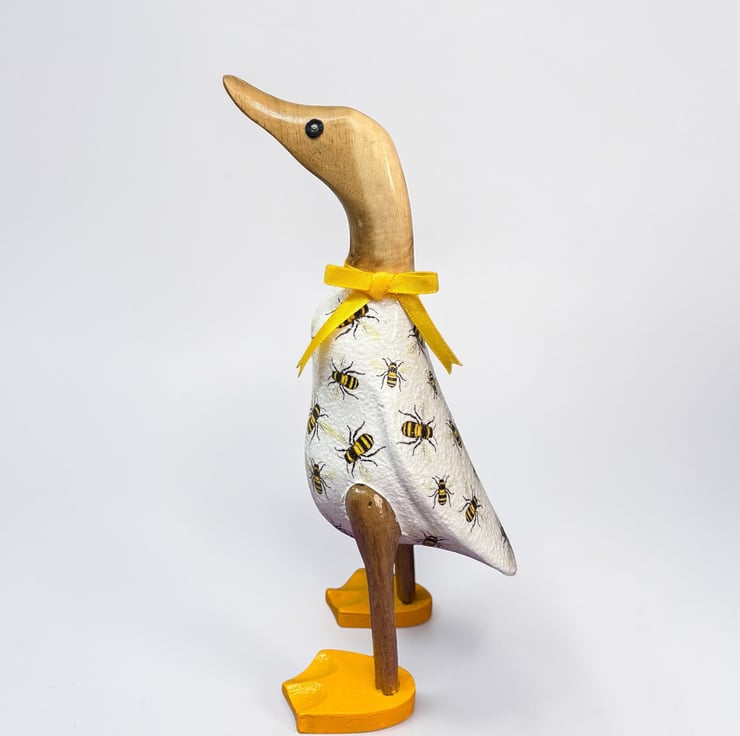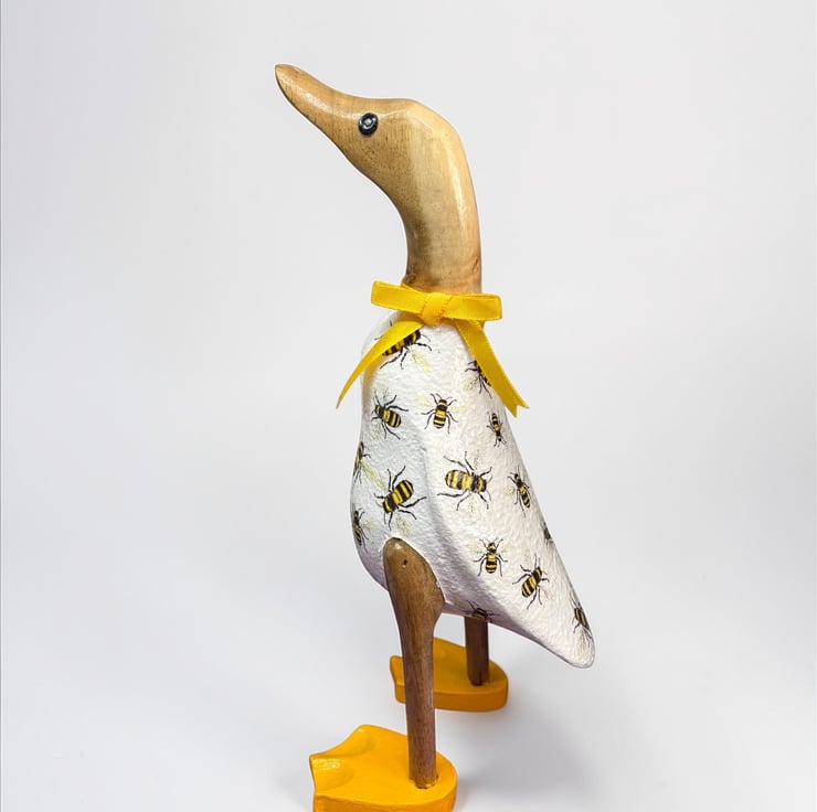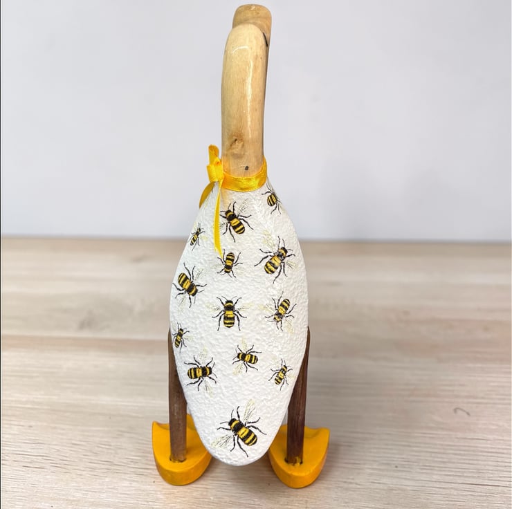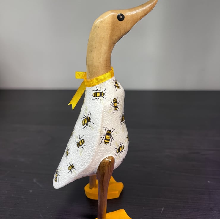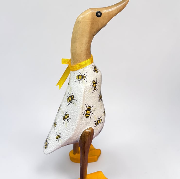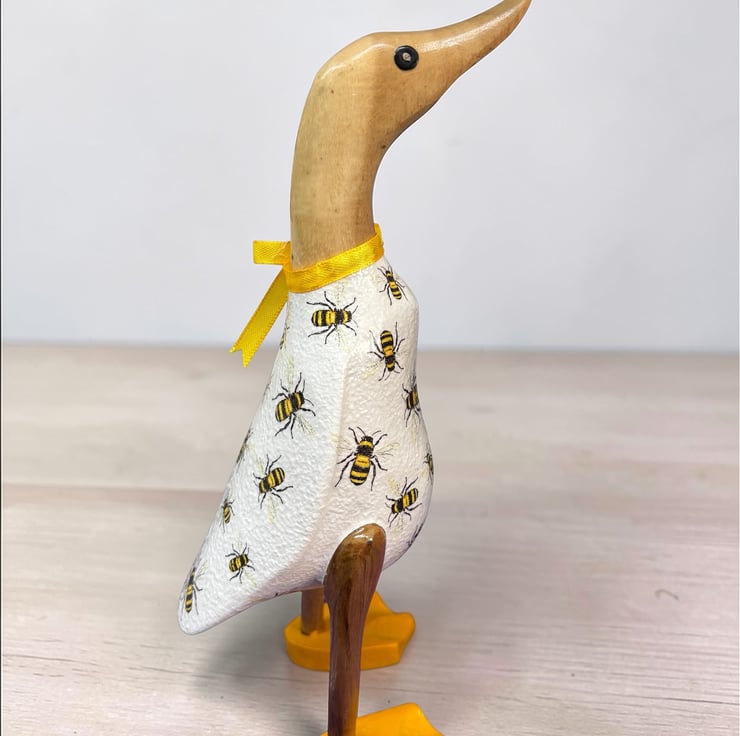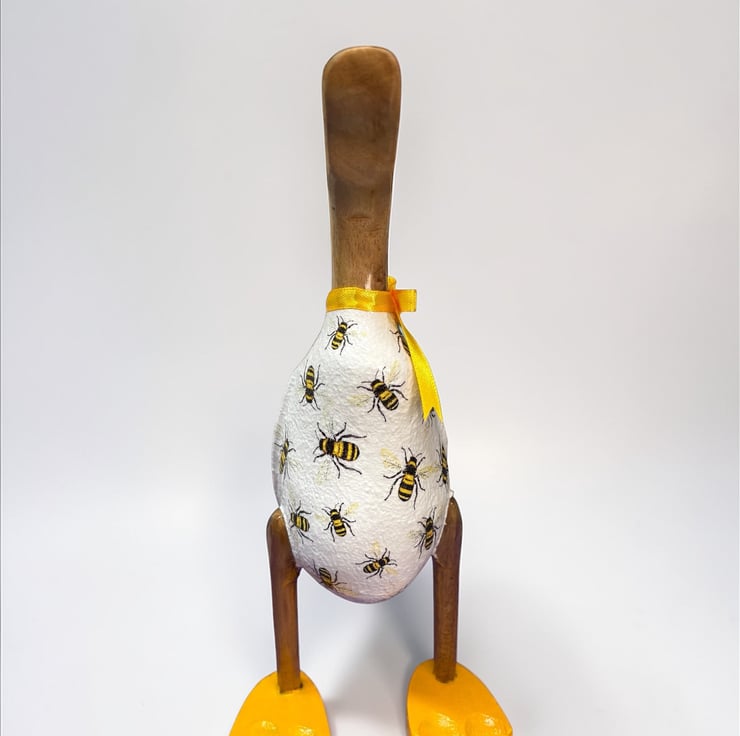 This small (approx 24 cm) bamboo duck has been hand painted and then decoupaged using a paper napkin featuring beautiful honey bees. It's finished off with a cute yellow ribbon.