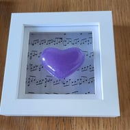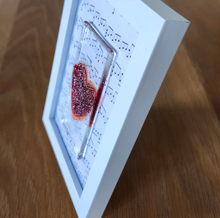 Red heart, made with small glass (frit) pieces and fused onto a glass panel, which is securely fastened to the glass of the picture. The frame is white. The musical notes of Moonlight Sonata, a romantic musical piece, making it an ideal, bespoke wedding, anniversary gift. The picture can be free standing or hung and measures 17x12cm