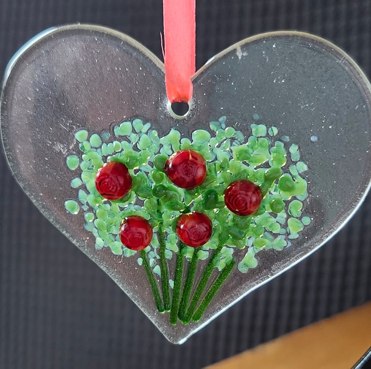 Fused glass heart, featuring a bouquet of tiny red roses. It measures 6cm and a has a red ribbon for hanging, with a base of clear glass, so that the light can pass through, ideal for hanging in or near the window.
