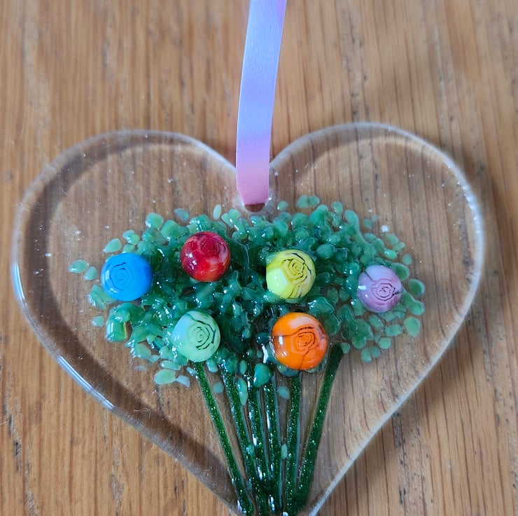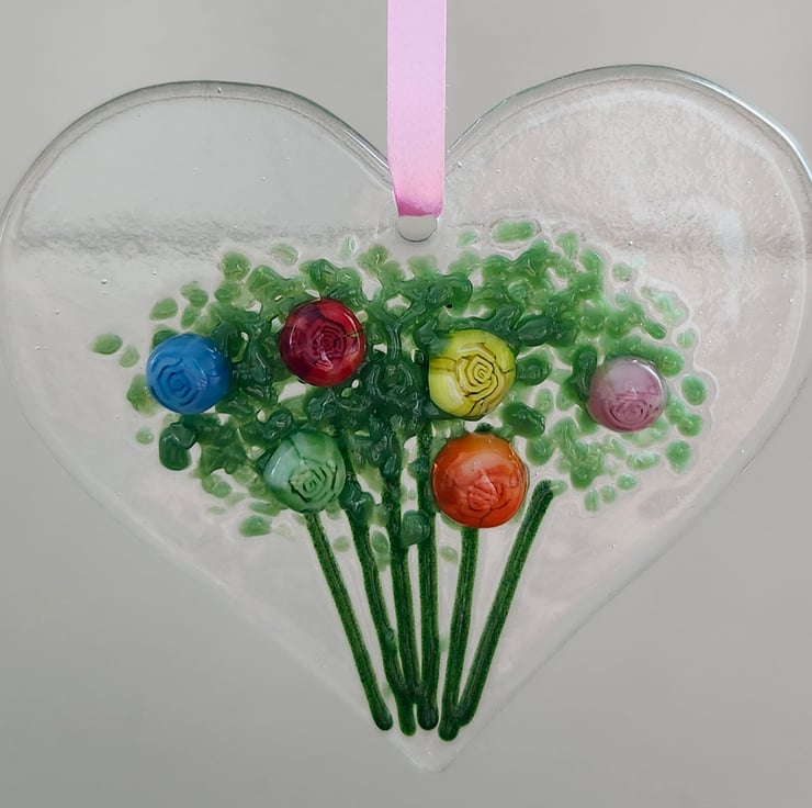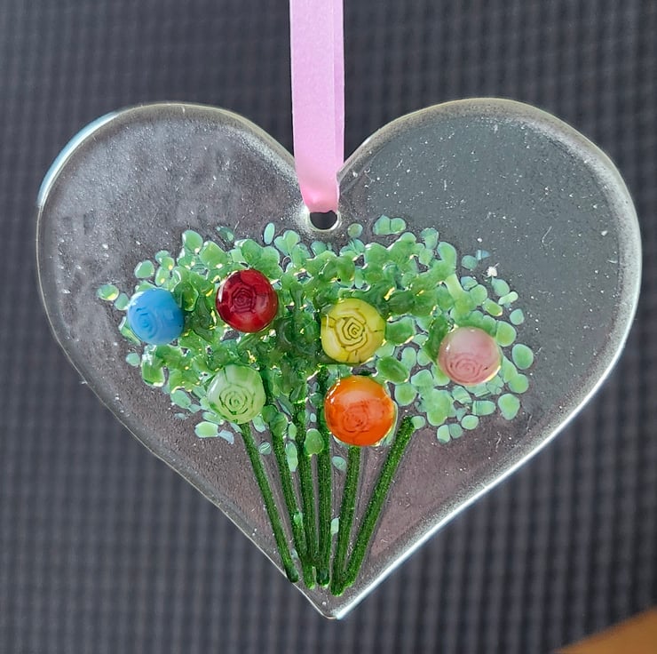 Fused glass heart, featuring a bouquet of tiny coloured roses. It measures 6cm and a has a pink ribbon for hanging, with a base of clear glass, so that the light can pass through, ideal for hanging in or near the window.