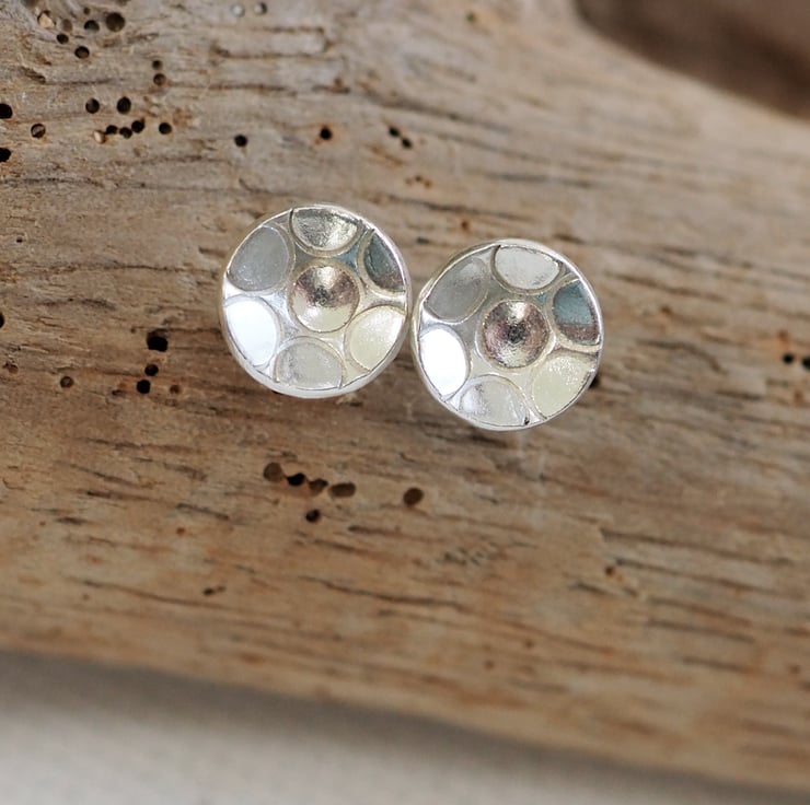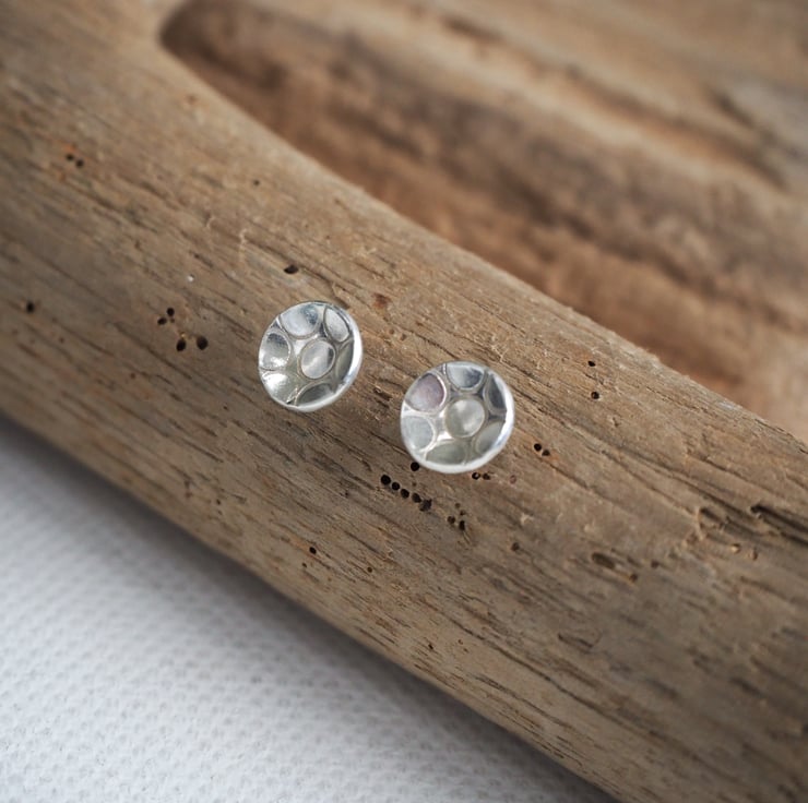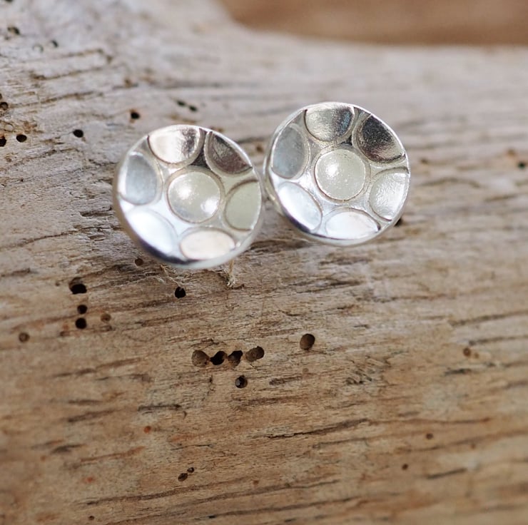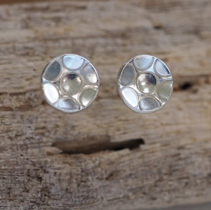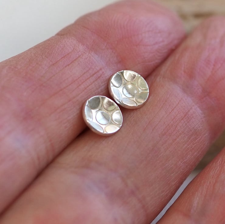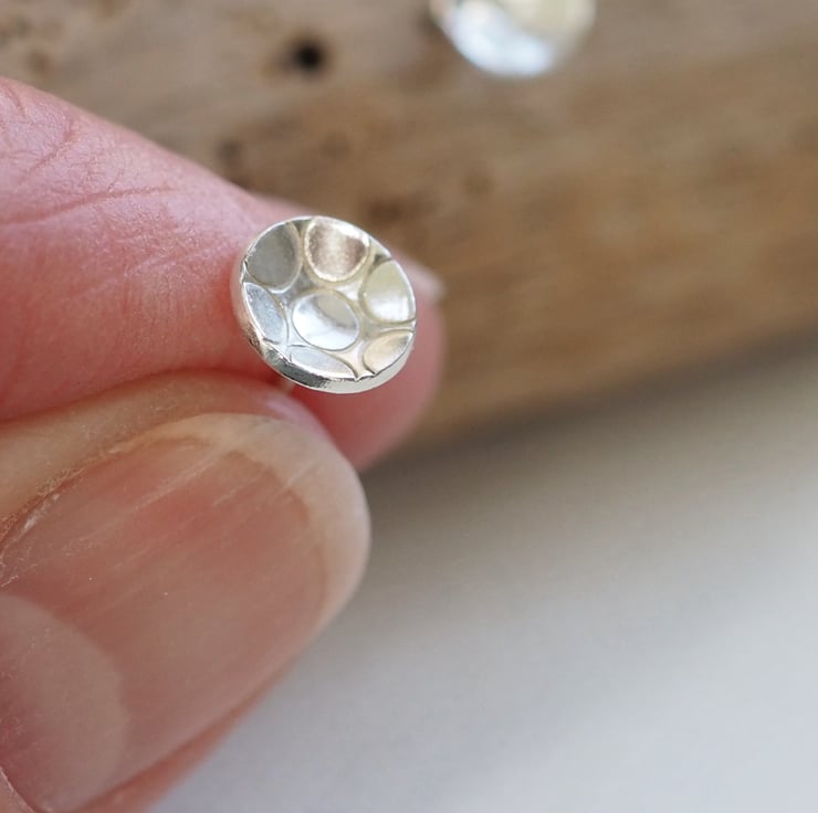 Small round unisex sterling silver stud earrings with ring texture punched into the silver. These stylish silver earrings are great for everyday wear and would make a lovely gift.