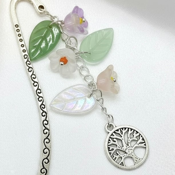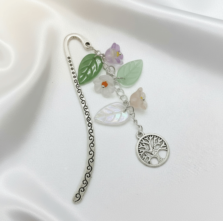 Lovely bookmark featuring a Tibetan Silver Hook, a chain that has glass flowers and leaves cascading down to a lovely Tree of Life Charm, perfect for any flower loving reader, and will look pretty on your bookshelf too. Will be gift wrapped in pretty tissue and an organza bag