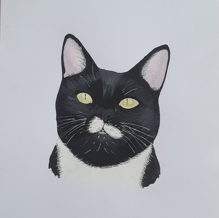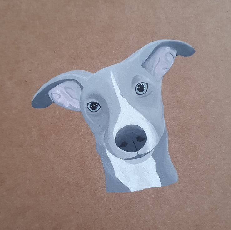 Pet portrait painted with acrylic on to brown or white card 14.5cm x 15cm. Please send several reference photos of your pet/s and let me know if you would like extra details or names added to your painting. I am completely happy to discuss portrait arrangements and details to ensure you get the portrait that does your furry friends justice!