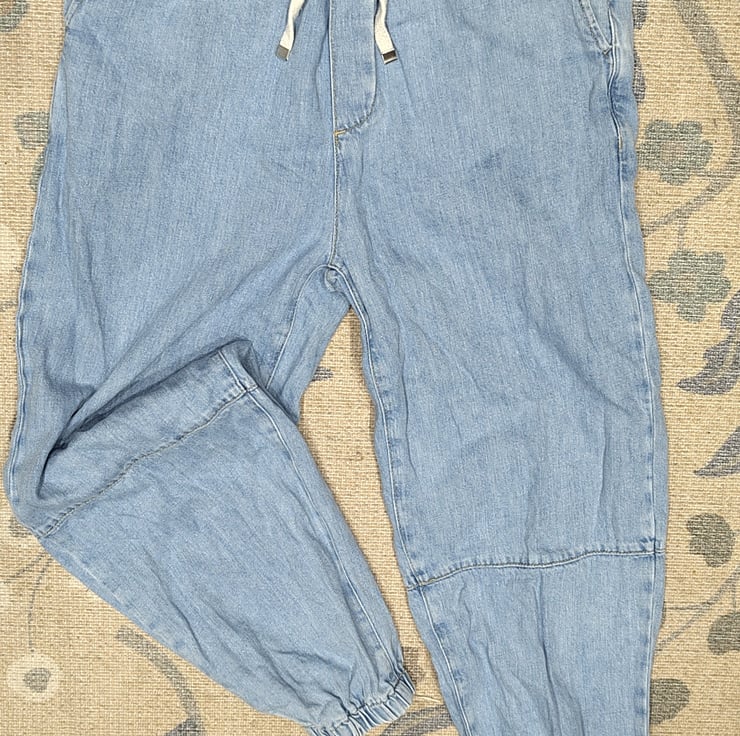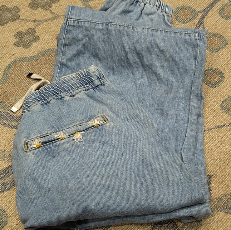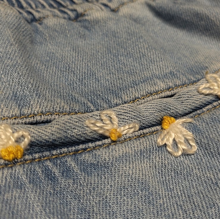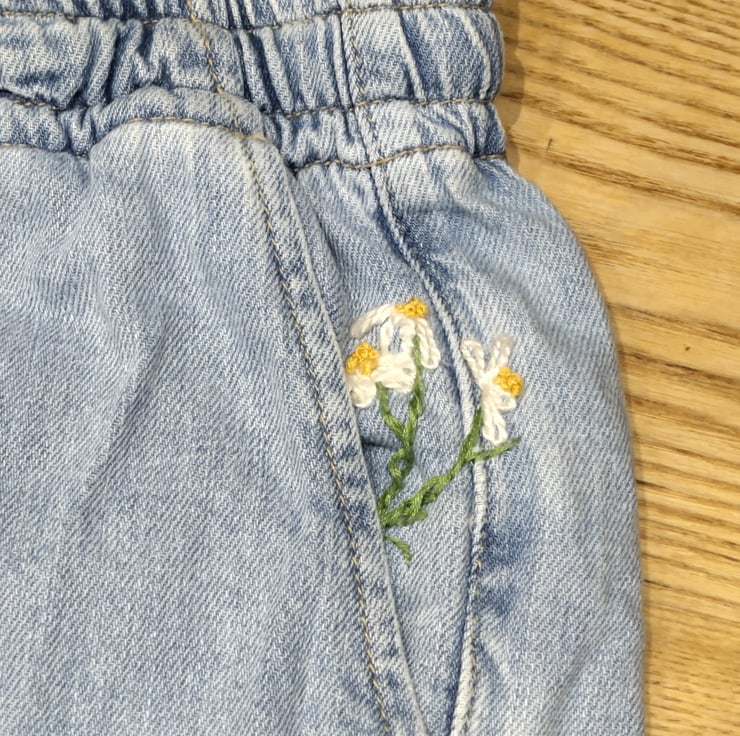 I've embroidered chamomile detailing into these beautiful joggie jeans (denim joggers) from Zara. Second-hand denim already, so a very sustainable purchase, and upgraded with a little bit of whimsy to carry you through your day, a reminder of mother earth's calming gifts in your pocket.