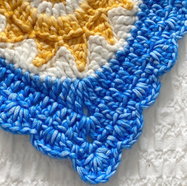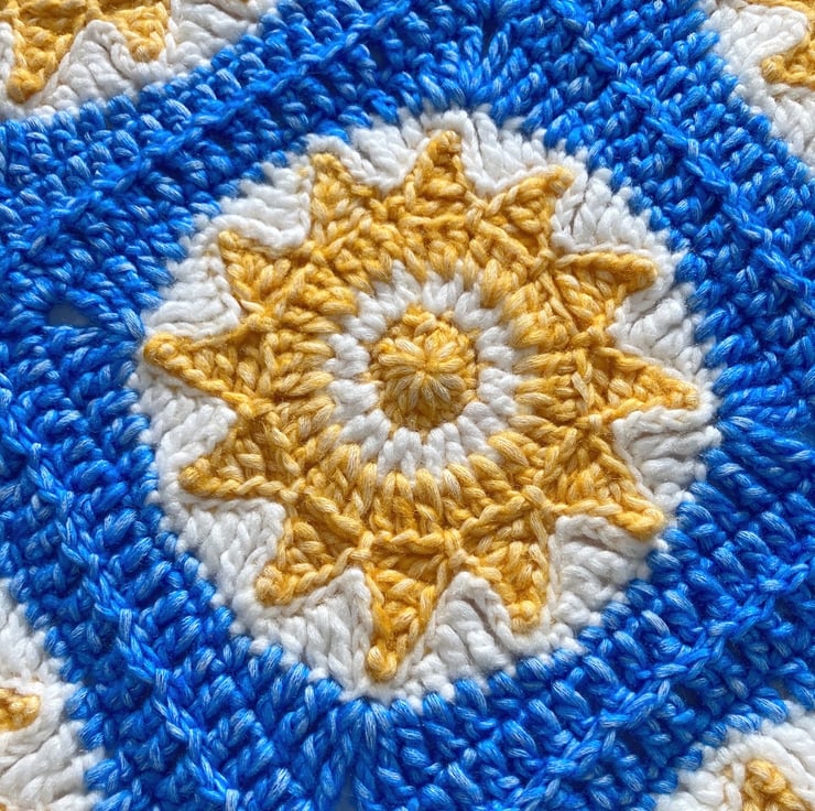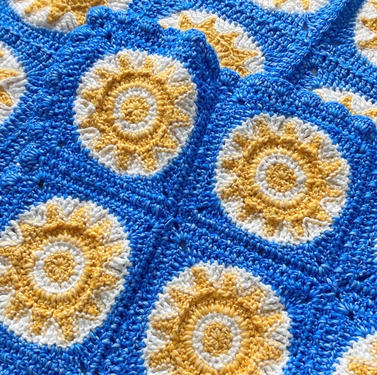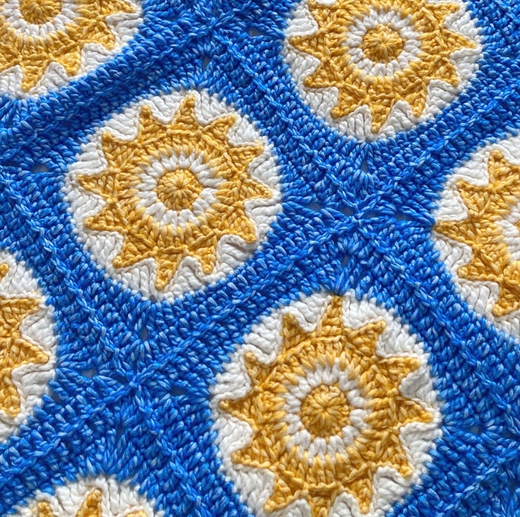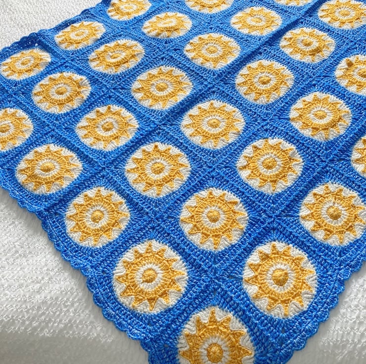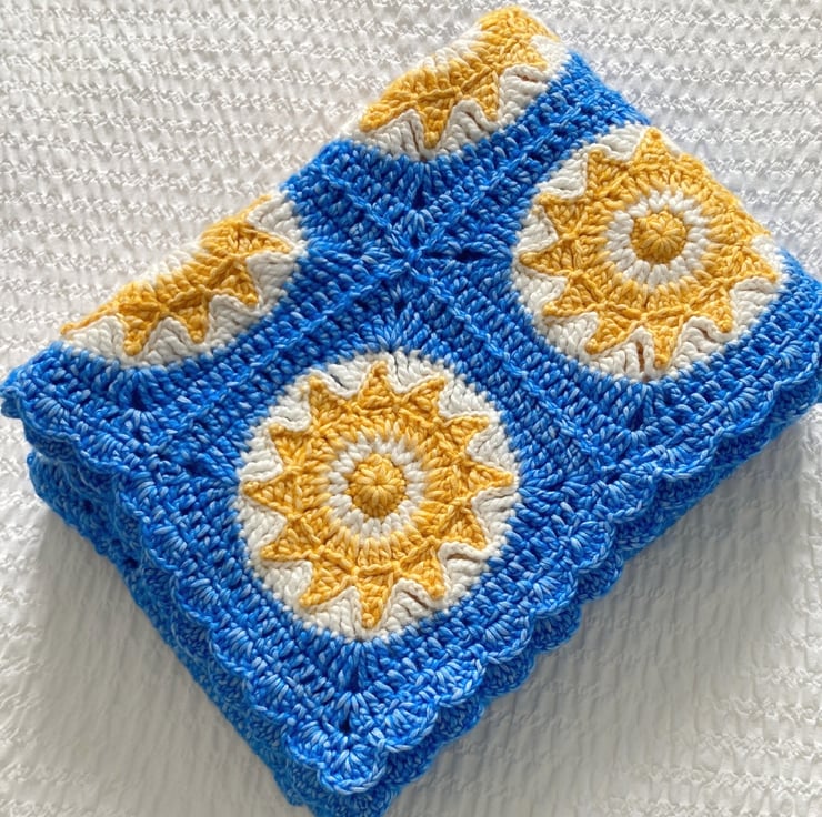 This crocheted blanket design is sun, blue sky and fluffy white clouds…..the yarn is a 67% cotton 33% acrylic blend., a gorgeous soft yarn.