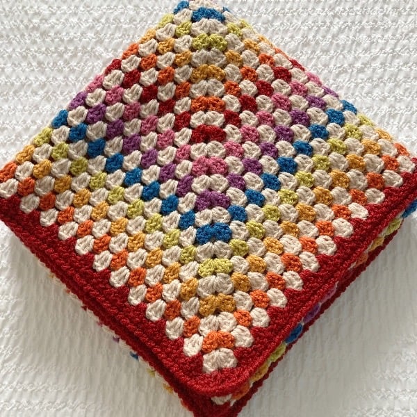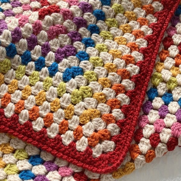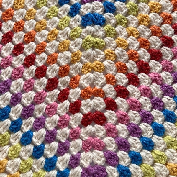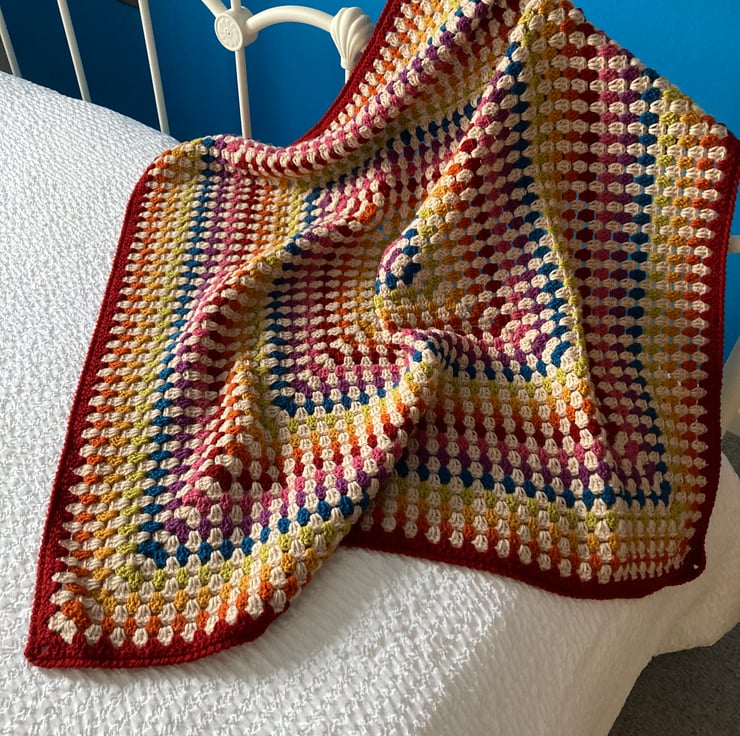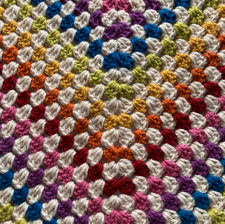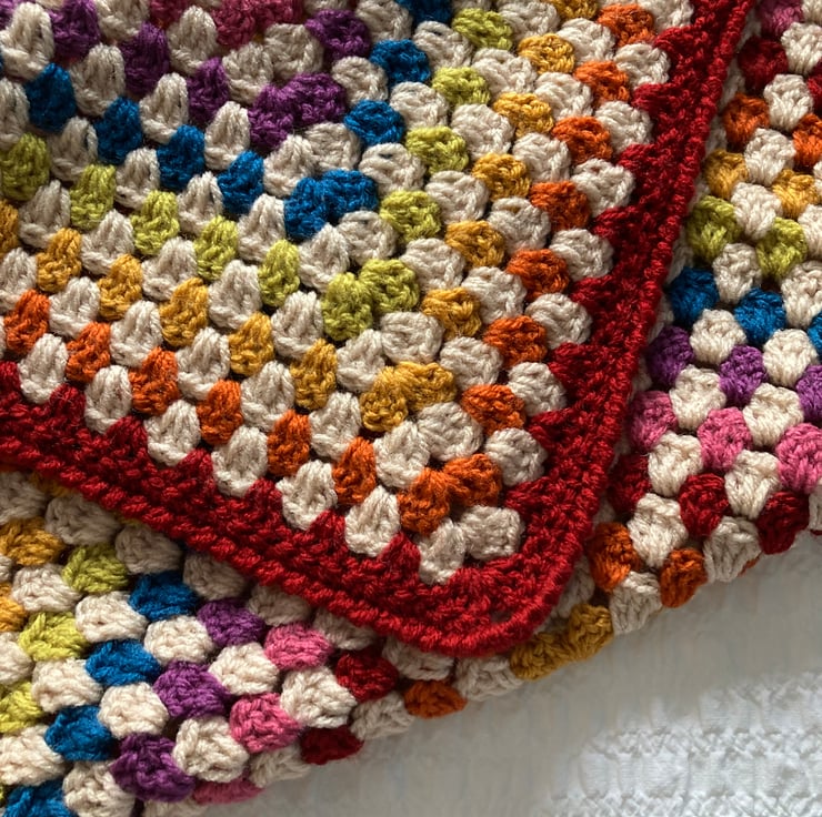 I think adding in the parchment colour really mutes the more vibrant colours giving a more vintage-y vibe to this granny square blanket, I have added my favourite turned edging to the blanket, it measures 89cm (35in) square