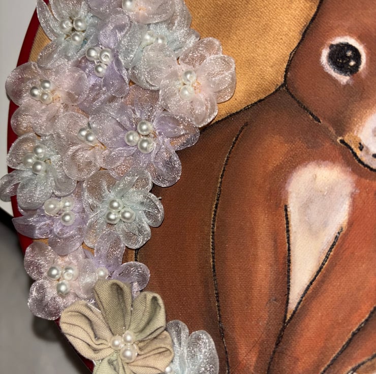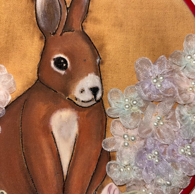 Rabbit illustration made from embroidery and water colours paint sitting silk handmade flowers. Framed in a red embroidery hoop 22cm. Fabric stained with coffee, do not get wet as water marks will show and colour may run.