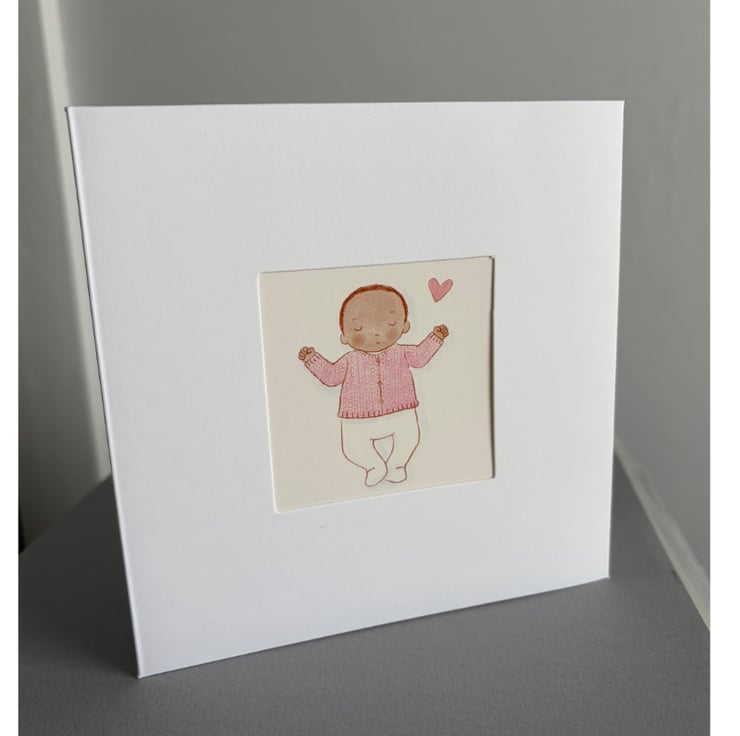 Card aperture featuring a baby girl sleeping with pink cardigan and pink heart