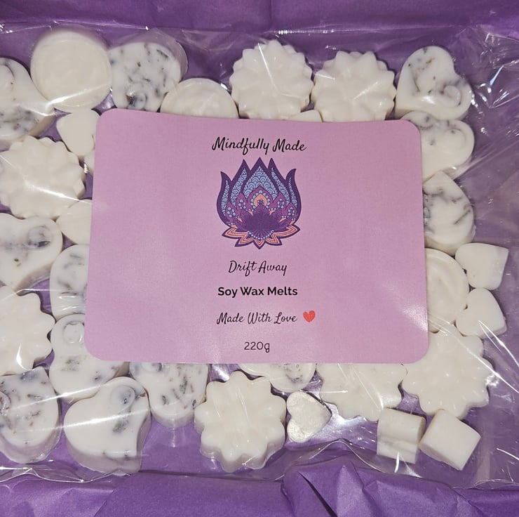 Relax and unwind with our Drift Away wax melts, hand poured in Edinburgh using natural soy wax. Each small batch melt is fragranced with a calming blend of lavender, cedarwood, lemon and ylang ylang, and infused with dried lavender. Due to their handmade nature, each melt is unique and offers a strong, long lasting scent.