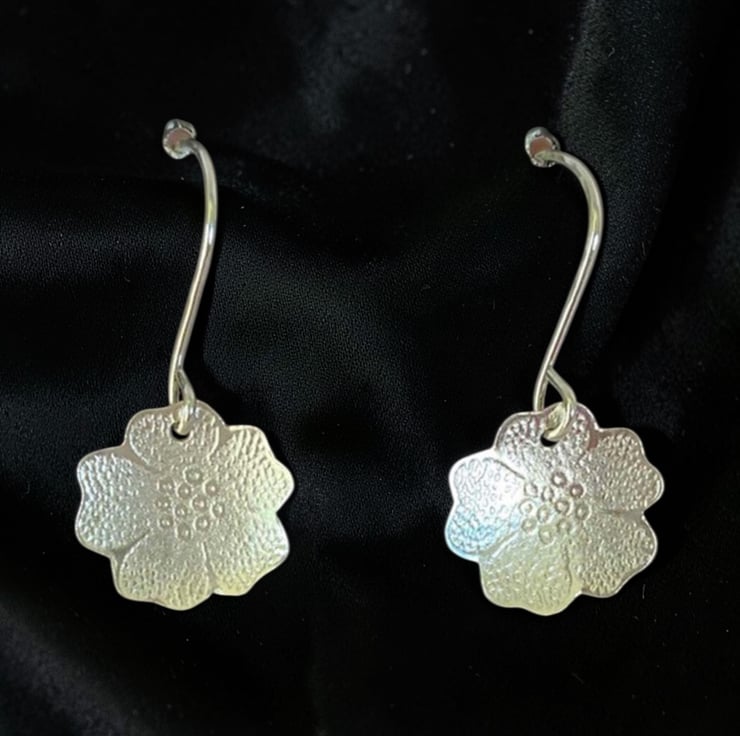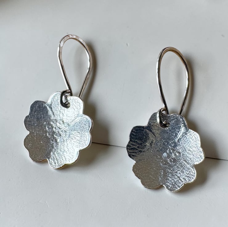 These lovely little pansy earrings are created from silver sheet. It is rolled through the rolling mill to imprint the pansy texture. They are then sawed out and sanded and smoothed to create beautiful pieces which hang from handmade sterling silver ear wires. These earrings are perfect for Spring or, in fact, any time of year and will be worn on repeat.