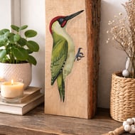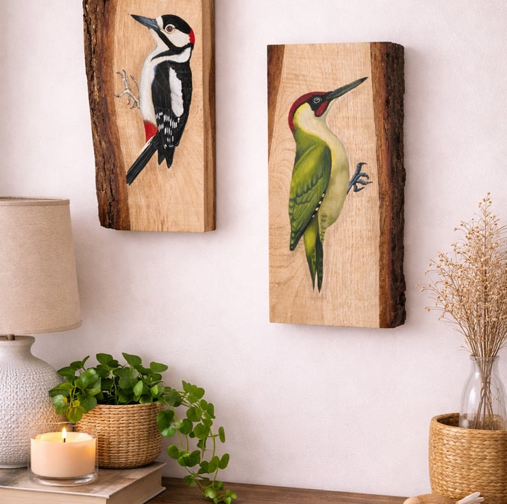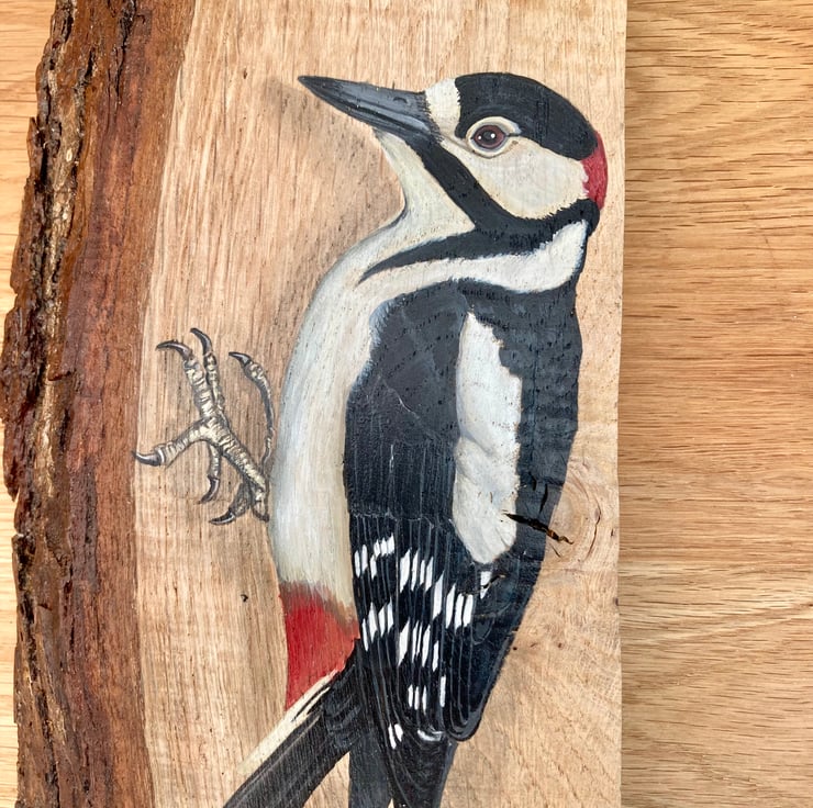 I have hand-painted this Great spotted woodpecker onto a live edge piece of Oak .