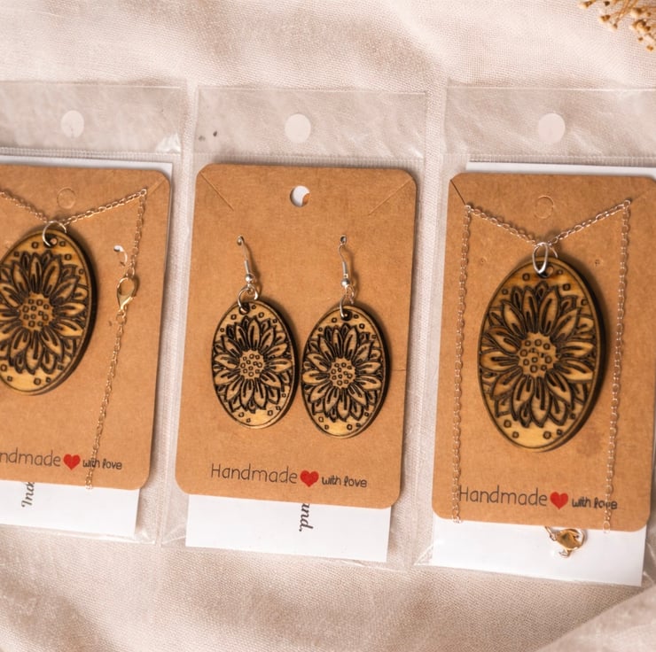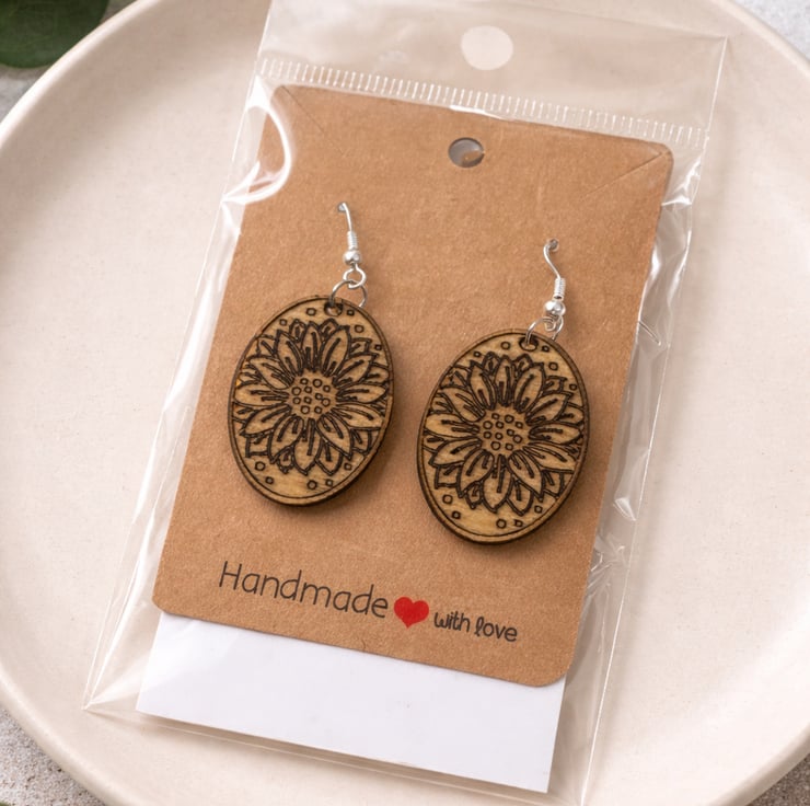 Earrings : https://folksy.com/find/item/8629197-Floral-Wooden-Earrings-Laser-Engraved-Lightweight-Jewellery-UK-hand-made