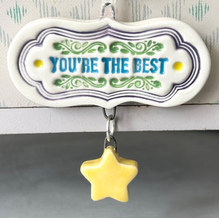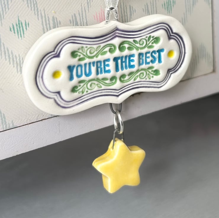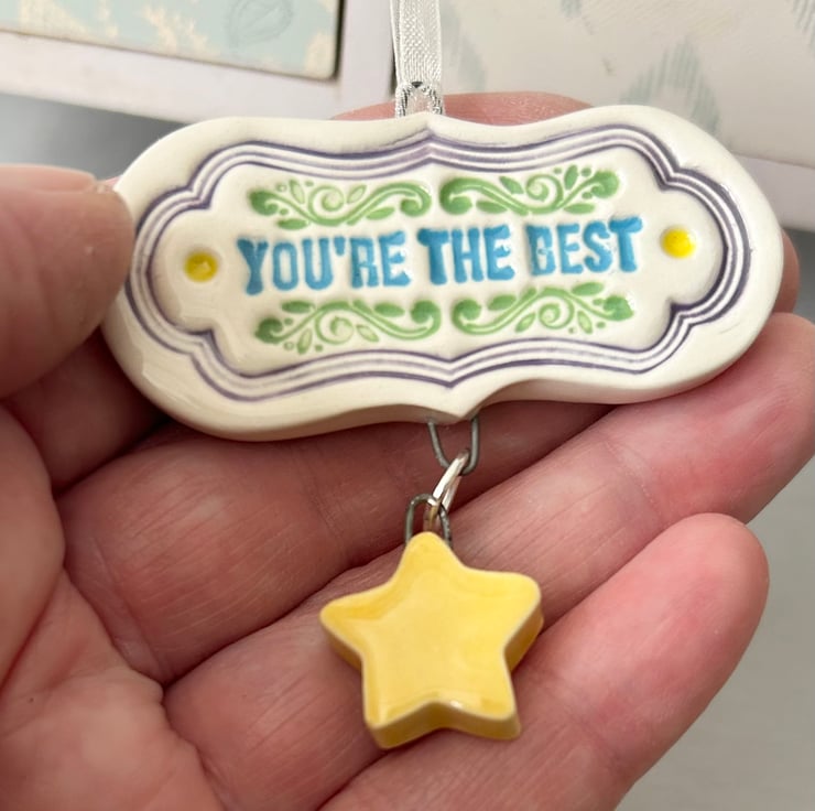 This little tag decoration is made from white earthenware clay and decorated with pattern. It has a dangly star. It looks like a mini medal perfect to give to somebody who you really admire! It has been fired twice and finished with a glossy glaze for a lovely smooth finish. It measures 5.5 x 5.5cm and hangs from a cream organza ribbon.