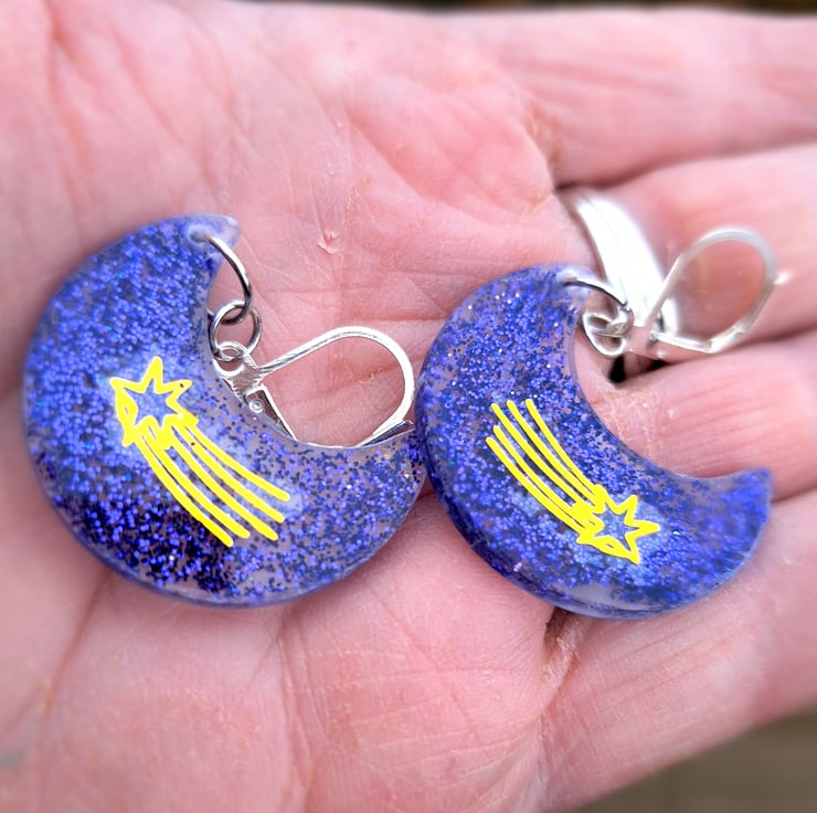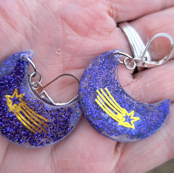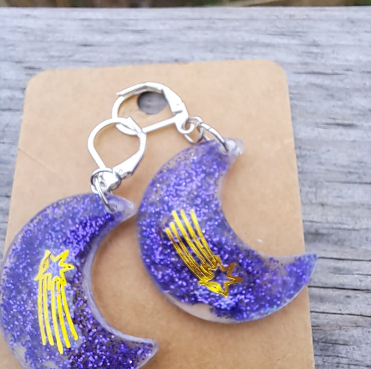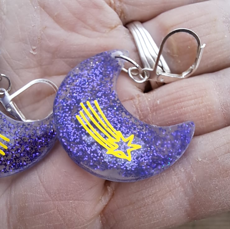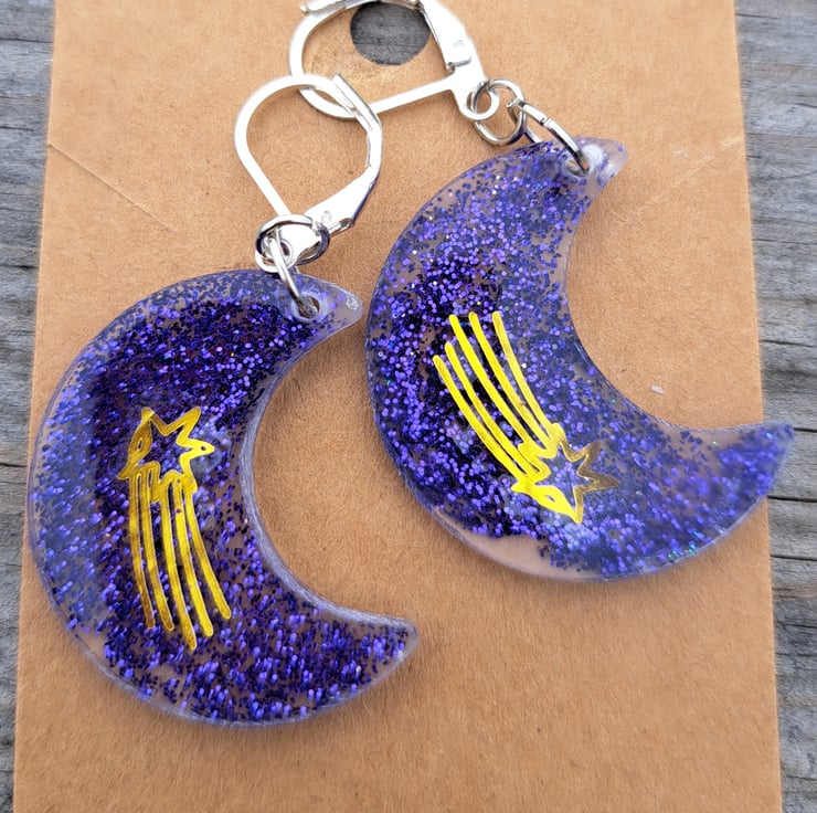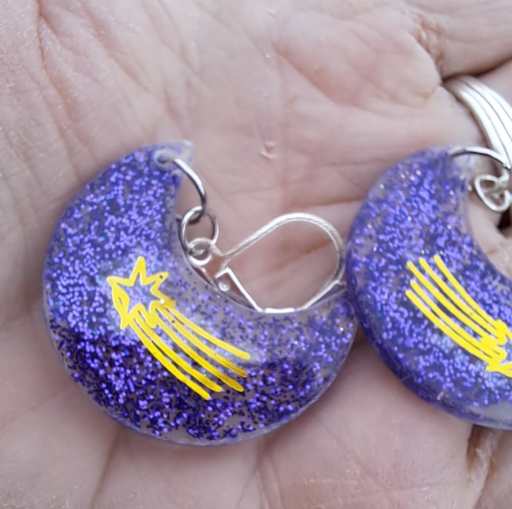 A funky pair of crescent moon shaped resin earrings filled with purple glitter and a shooting star motif/sticker. Hanging on a pair of hypoallergenic continental clasps.
