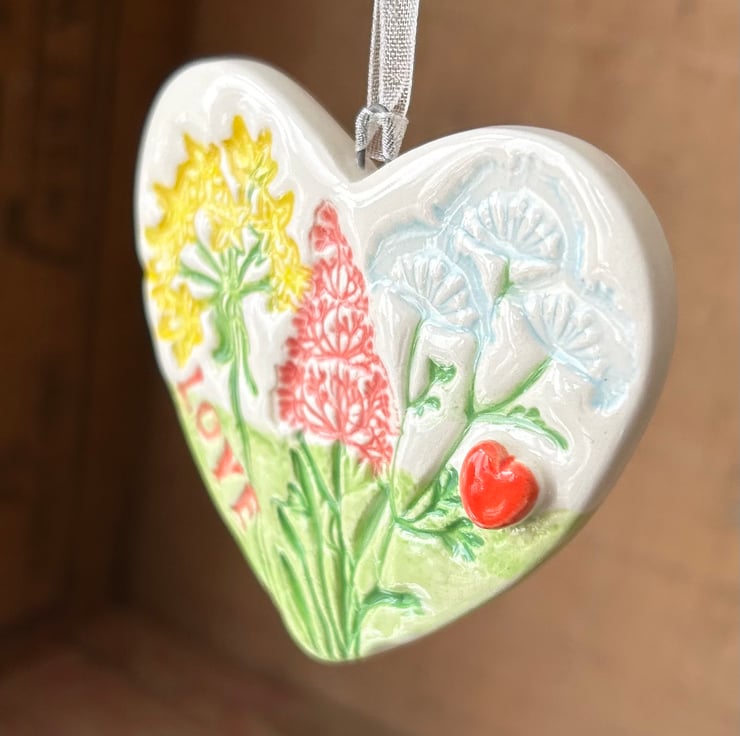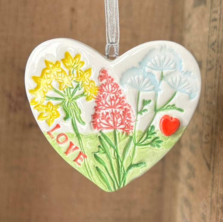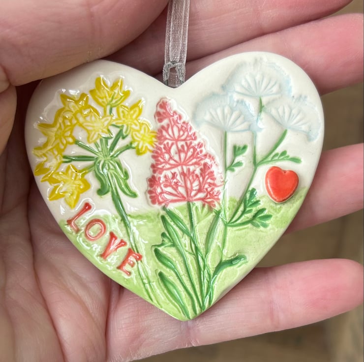 This little heart is made from white earthenware clay and stamped with a floral and lace pattern. It is imprinted with the word LOVE. It has been fired twice, once to the bisque stage and then a second firing for the clear glaze. It measures 6cm wide x 6cm height x 5mm thick. It can be hung outside.