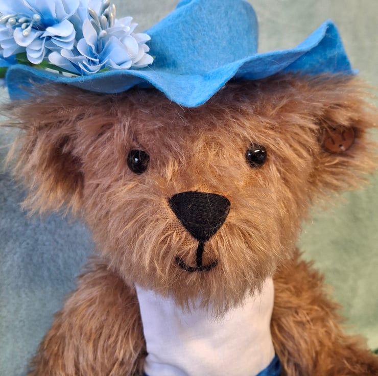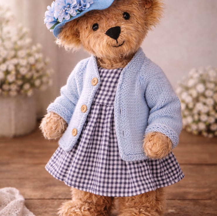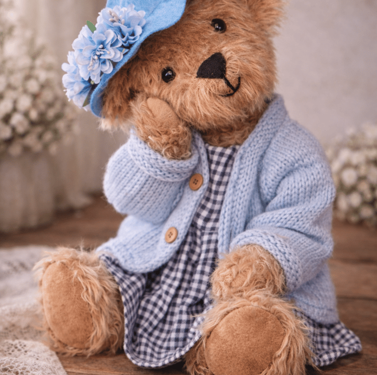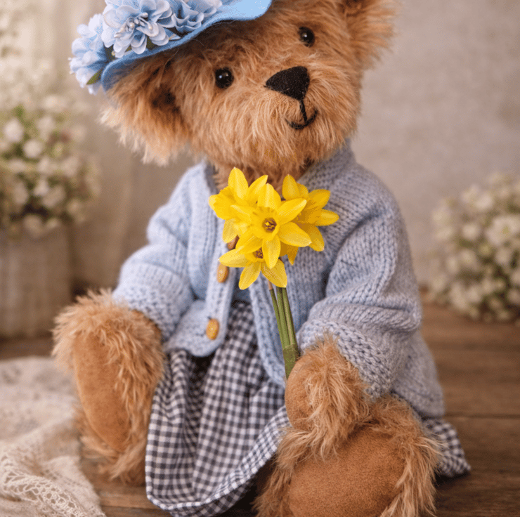 She is lovingly hand sewn from quality mohair and dressed in a pretty handmade outfit, complete with a cosy cardigan and a blue hat trimmed with tiny flowers. In her paws she holds a small posy of bright daffodils, adding a cheerful touch of spring.