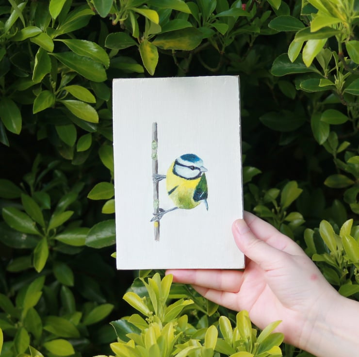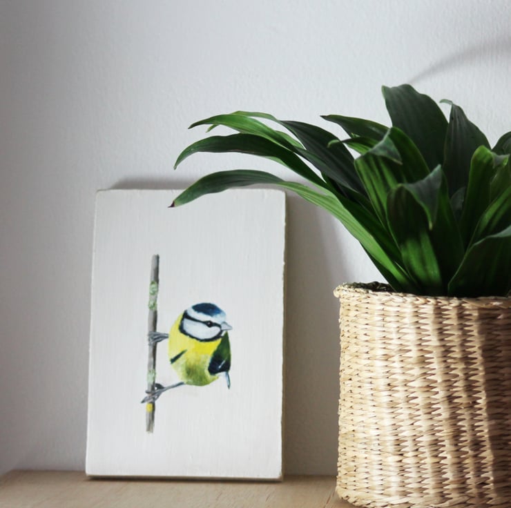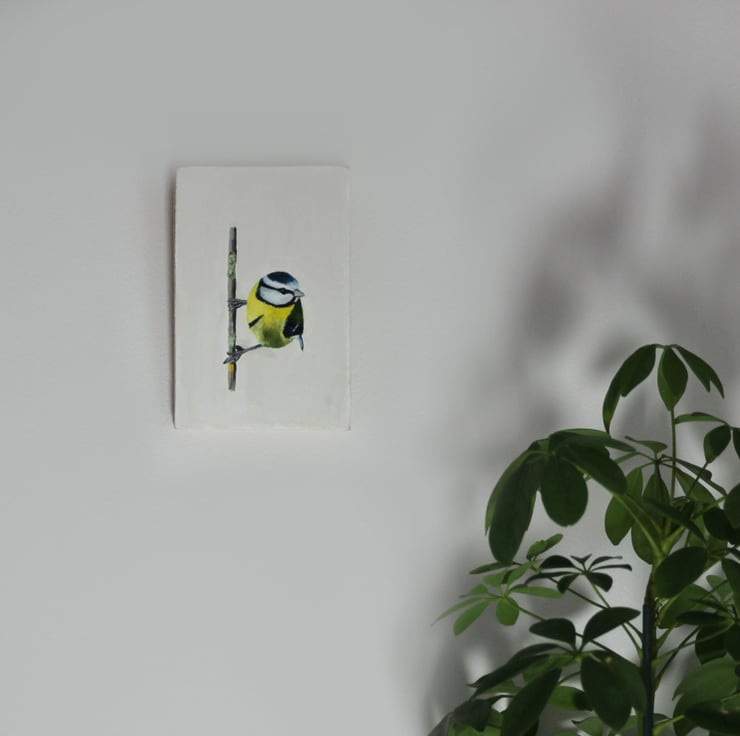 This is an original painting of a blue tit on reclaimed plywood and is inspired by one of my own photographs. It has been painted in acrylics and sealed with a thin protective coat of varnish.